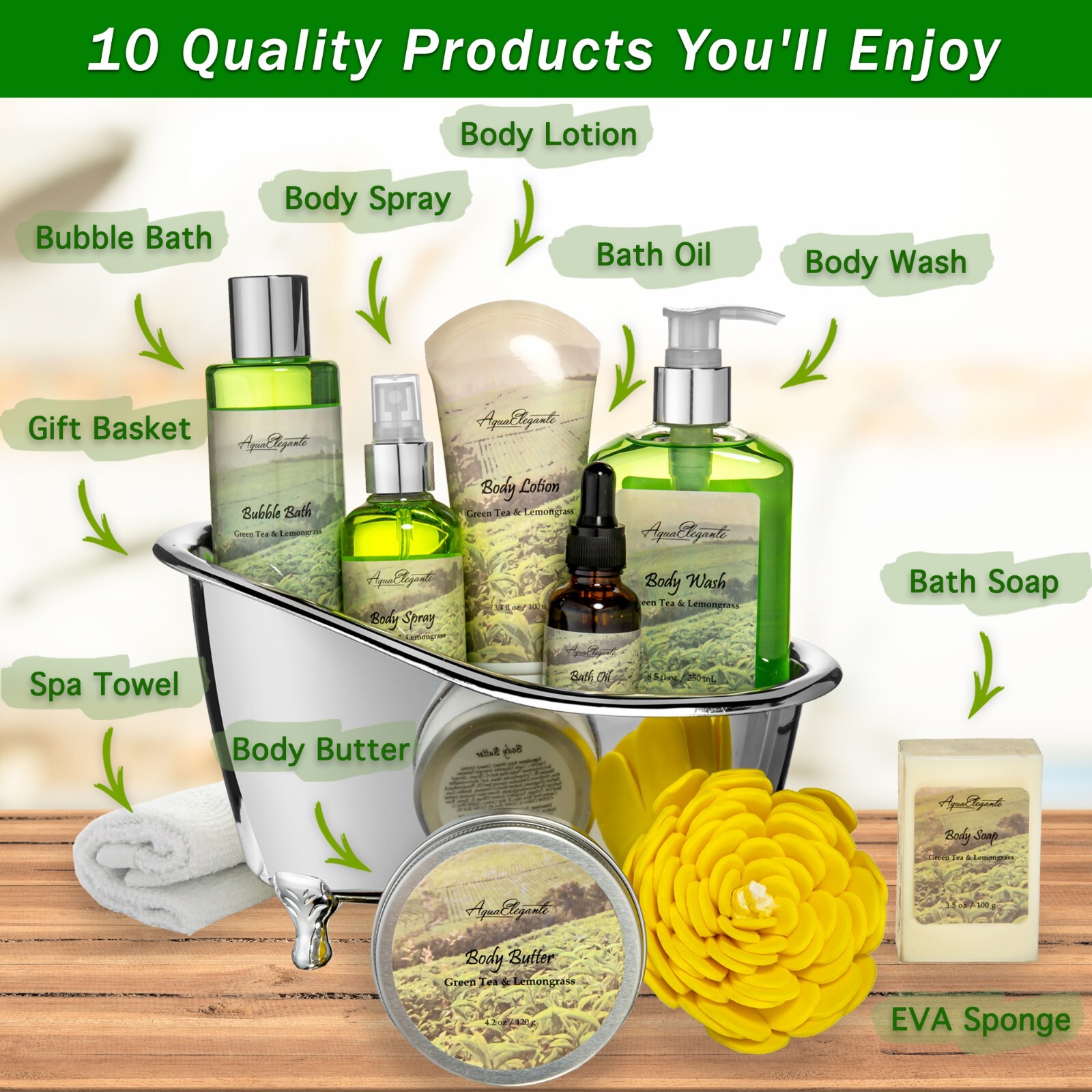 Luxury Spa Gift Set For Women Aqua Elegante - Basket of Green Tea Lemongrass