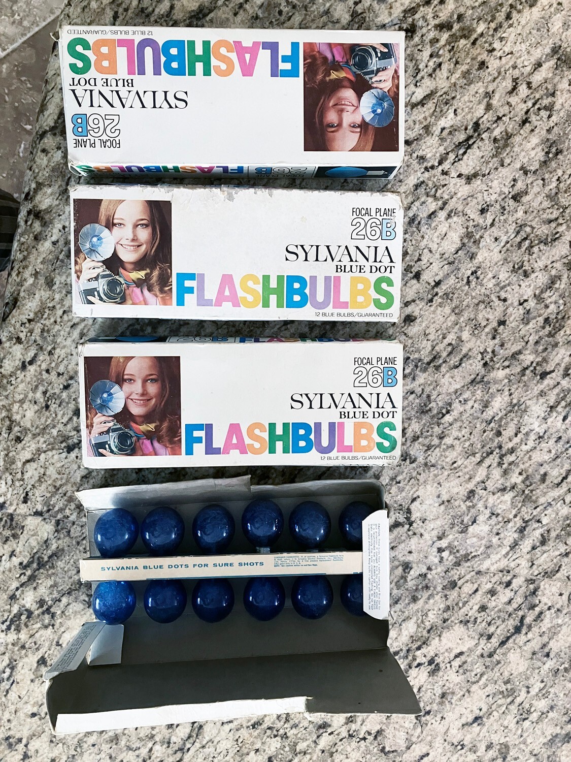 как выглядит 1 Vintage 12-count Box of Sylvania Blue Dot 26B Flashbulbs - NOS фото