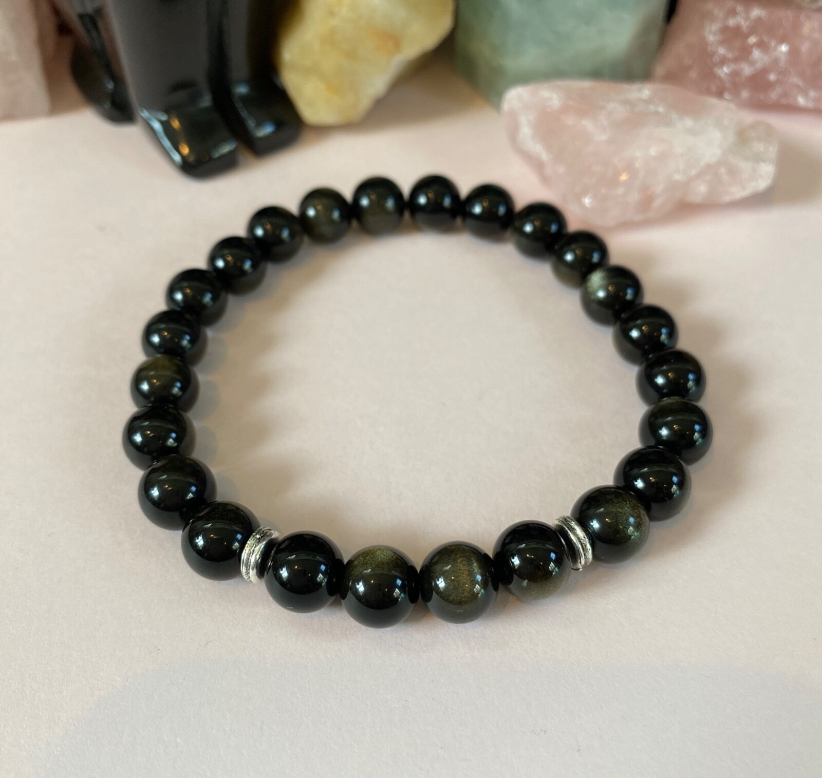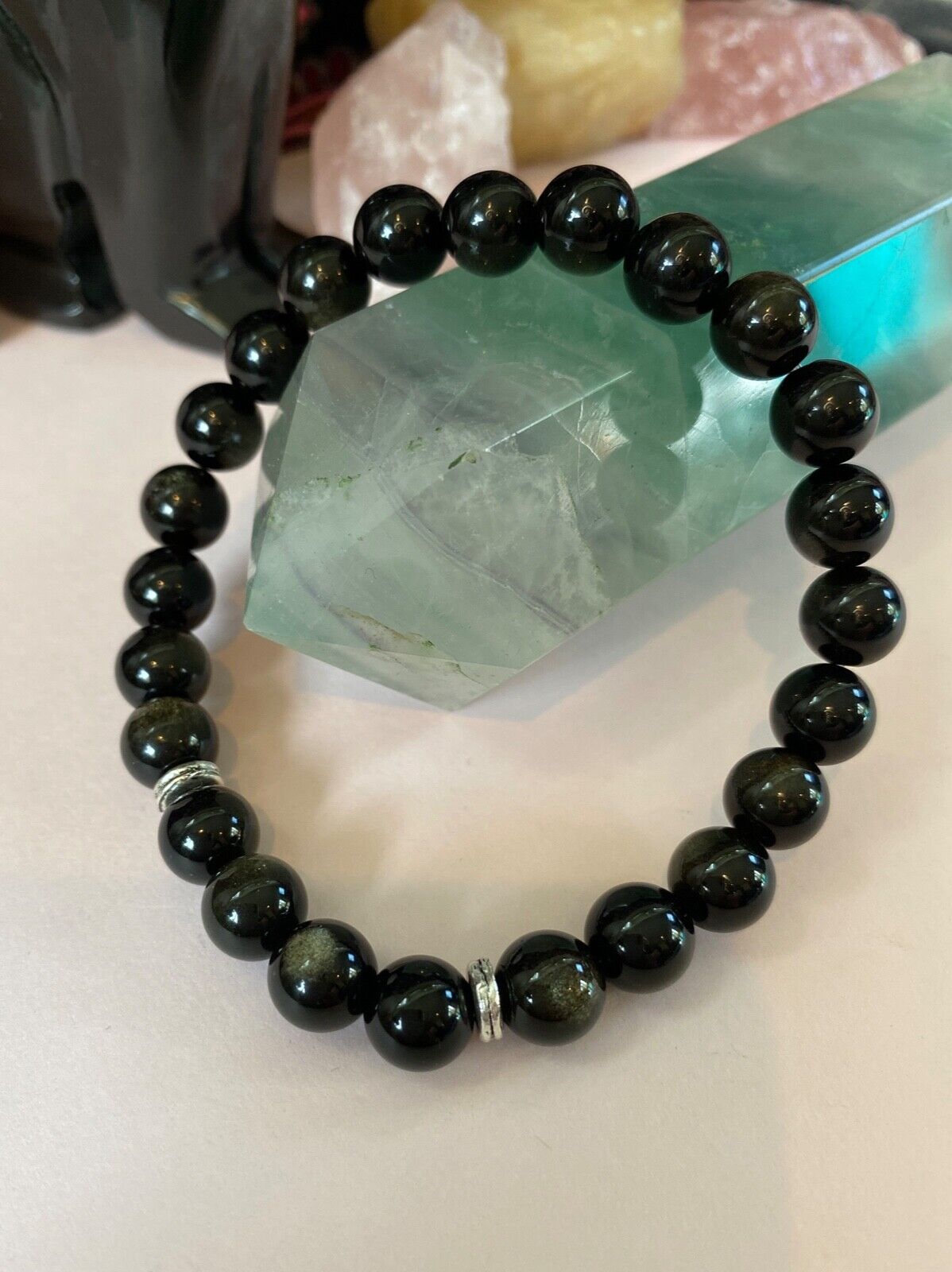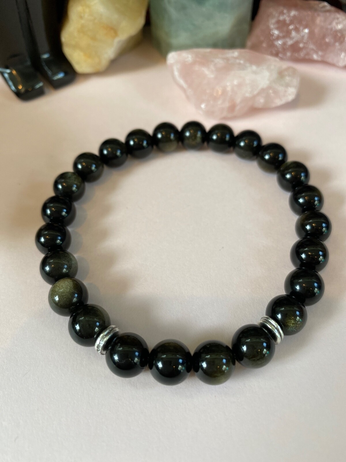 Men's Golden Black Obsidian Gemstone Bracelet. 8 inch. Handsome.