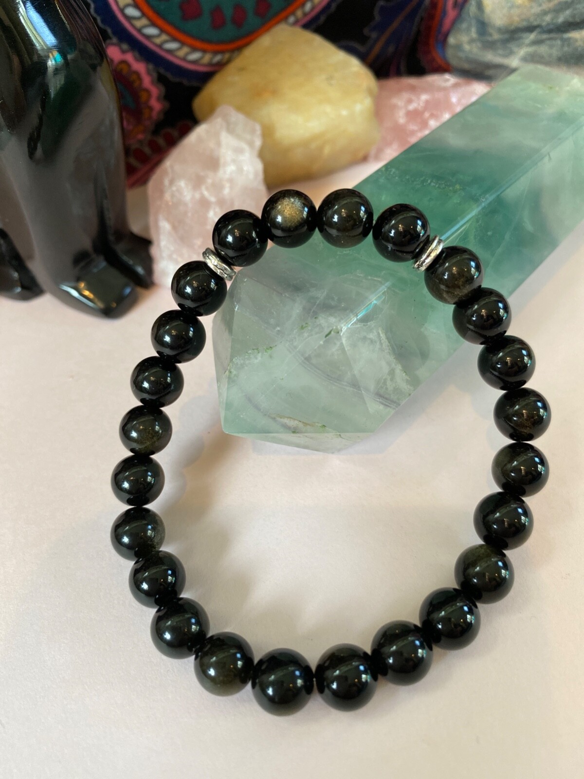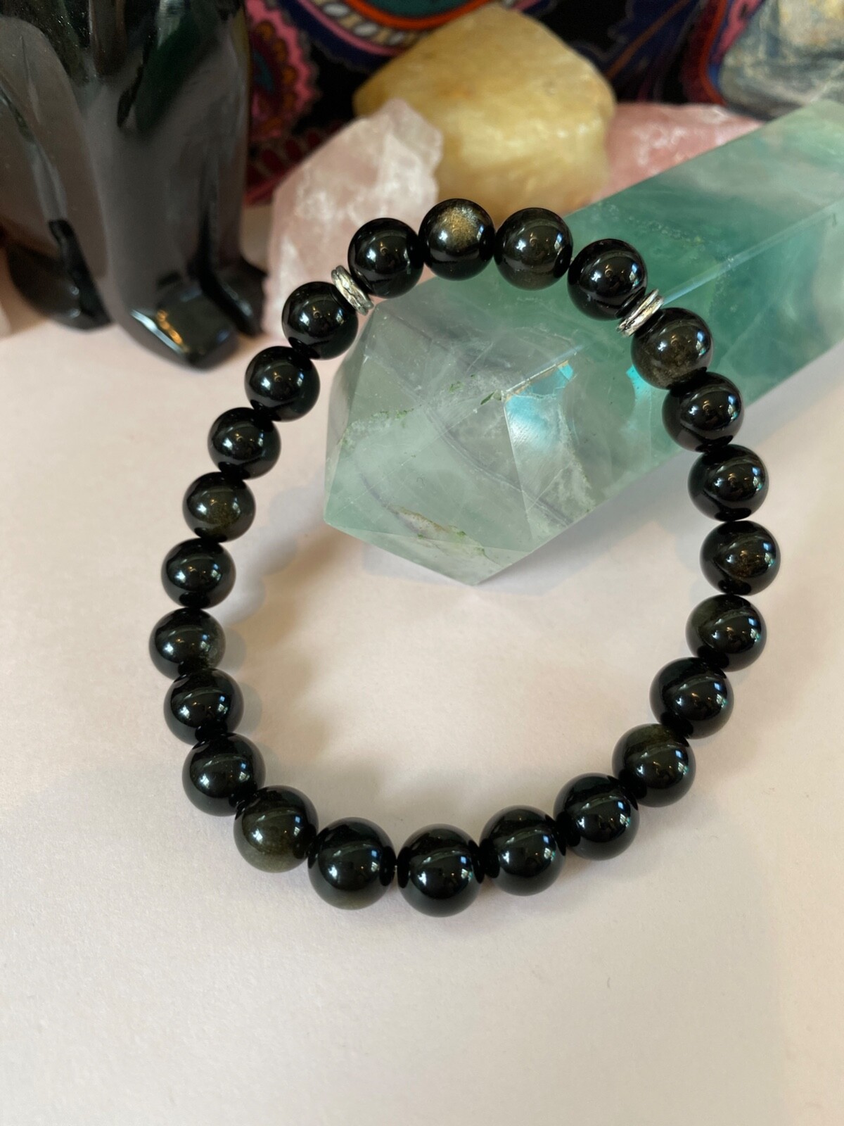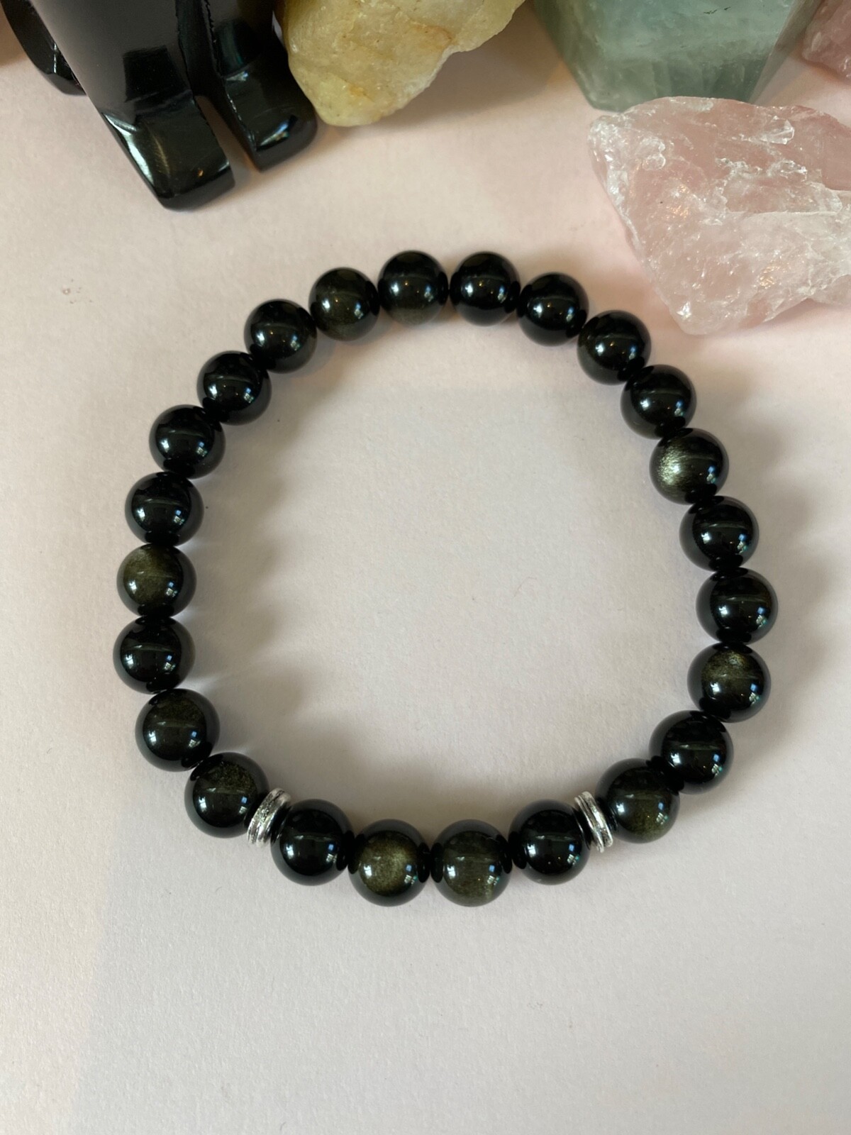 Men's Golden Black Obsidian Gemstone Bracelet. 8 inch. Handsome.