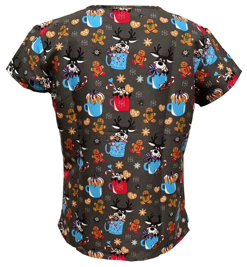 Women Fashion Christmas Medical Nursing Scrub Gray Warm Wishes Cookie Dreams XL
