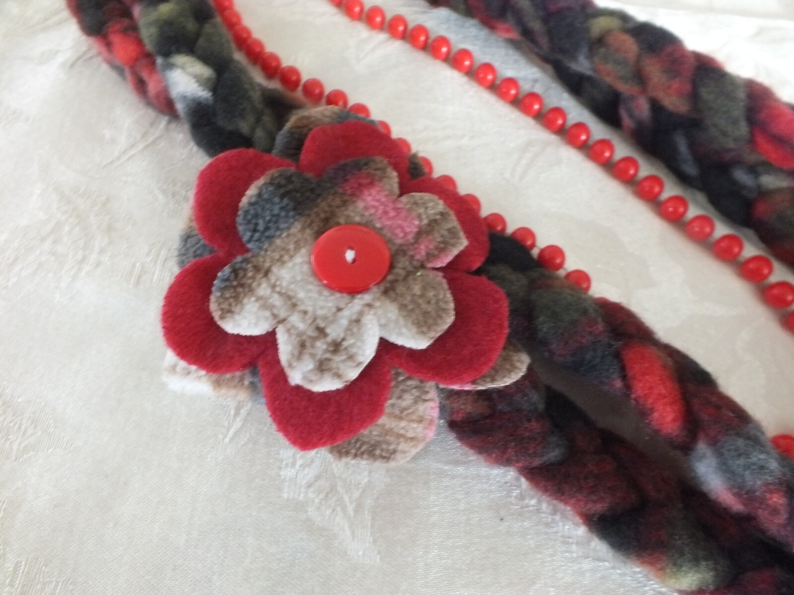 Upcycled Repurposed Fleece Scarf Necklace Braided Handmade Flower Red Bead Neckl