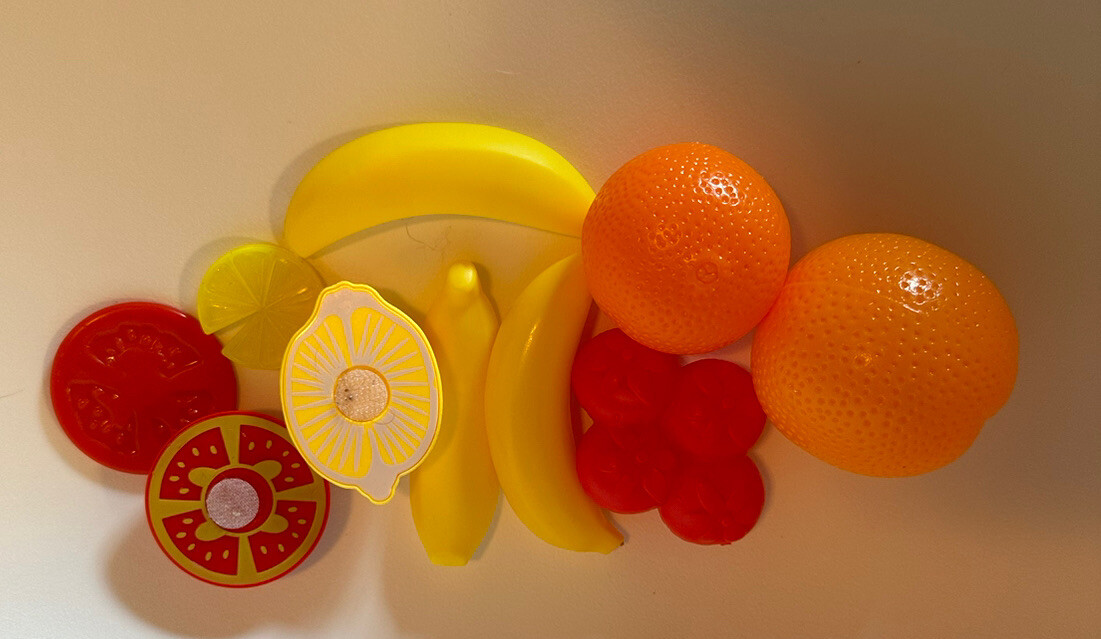 как выглядит Lot Of 58 Plastic Pretend Play Food Veggies, Fruit, Desserts, Pans, Plates фото