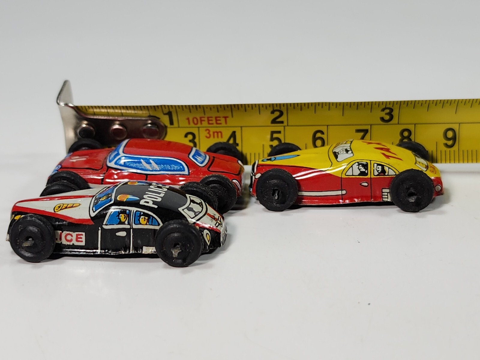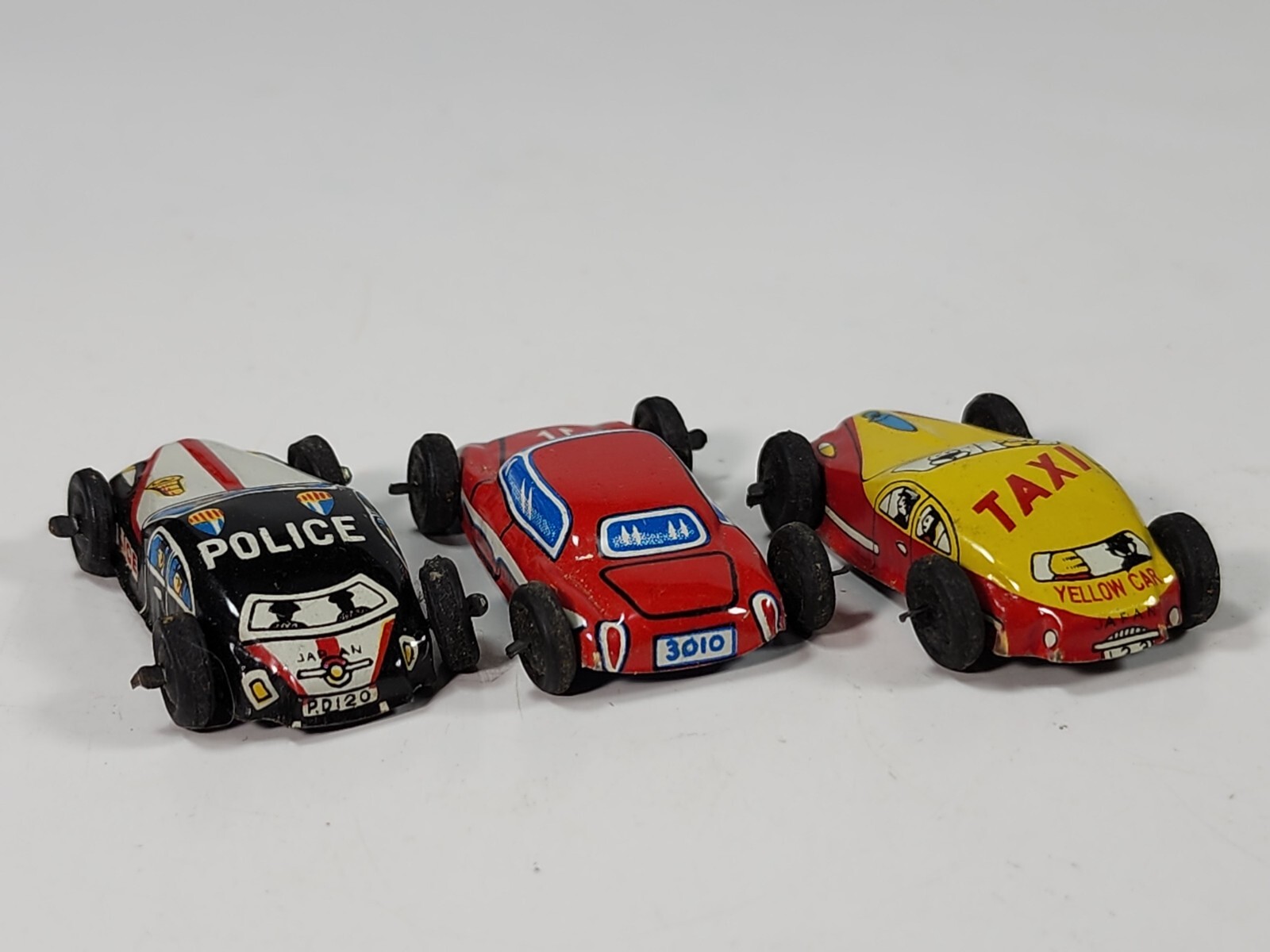 Vintage Tin Litho 1950s Miniature Cars Japan Police Taxi Yellow Cab Red Car 3010