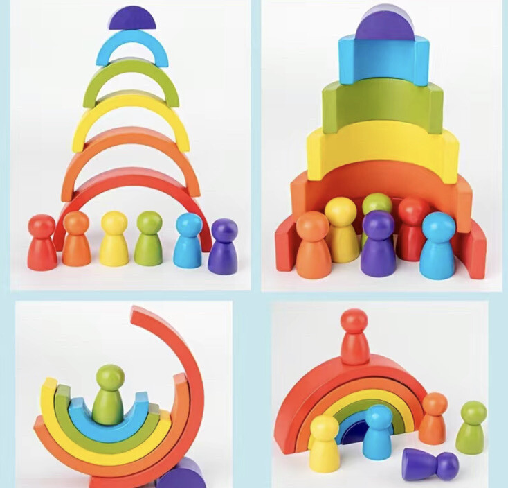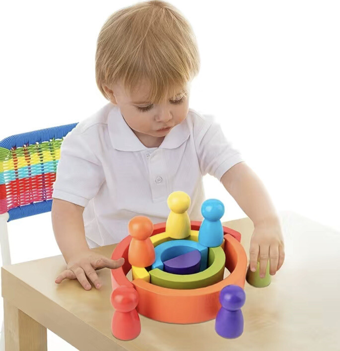 Wooden Rainbow Stacker Toy People Geometry Baby Toddler Montessori 14 Piece