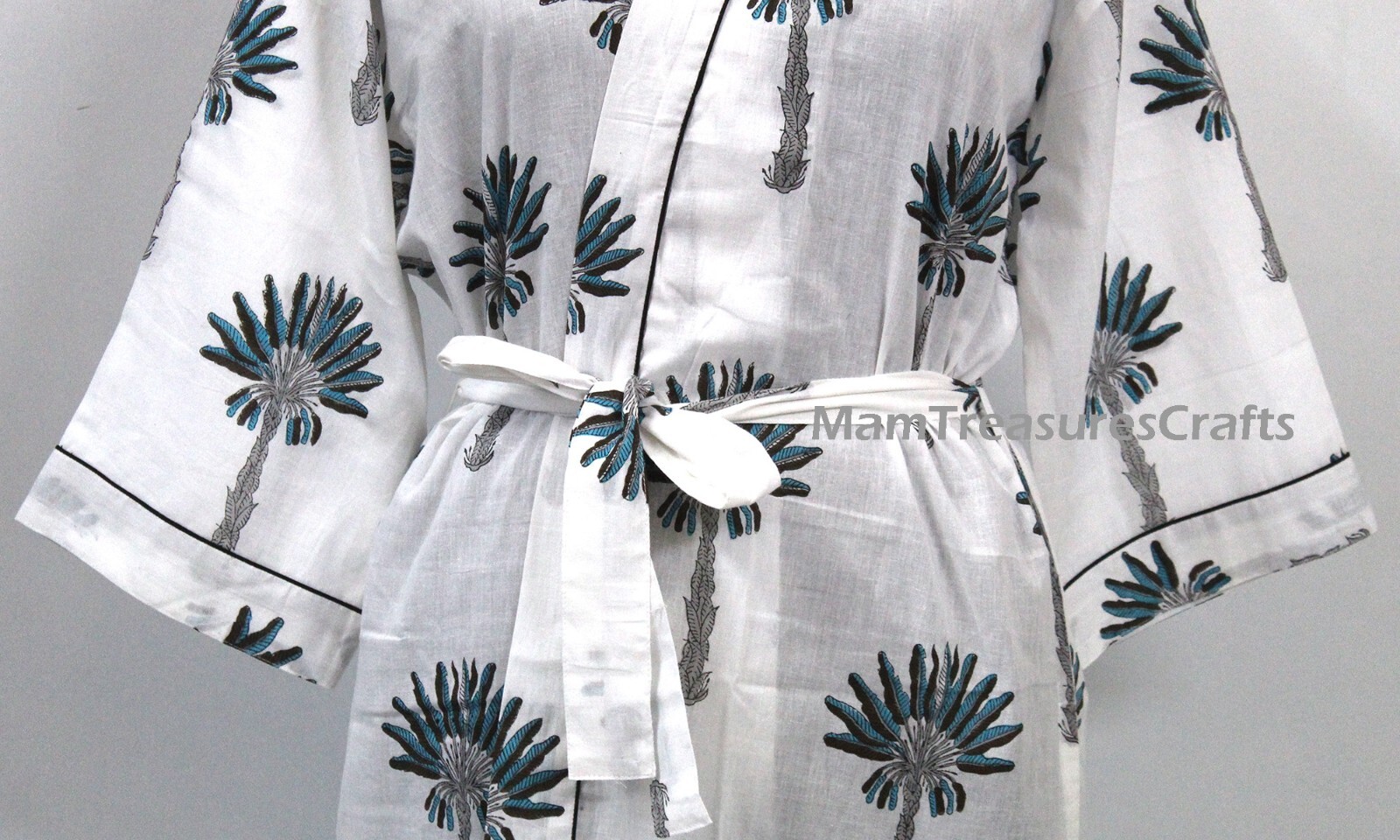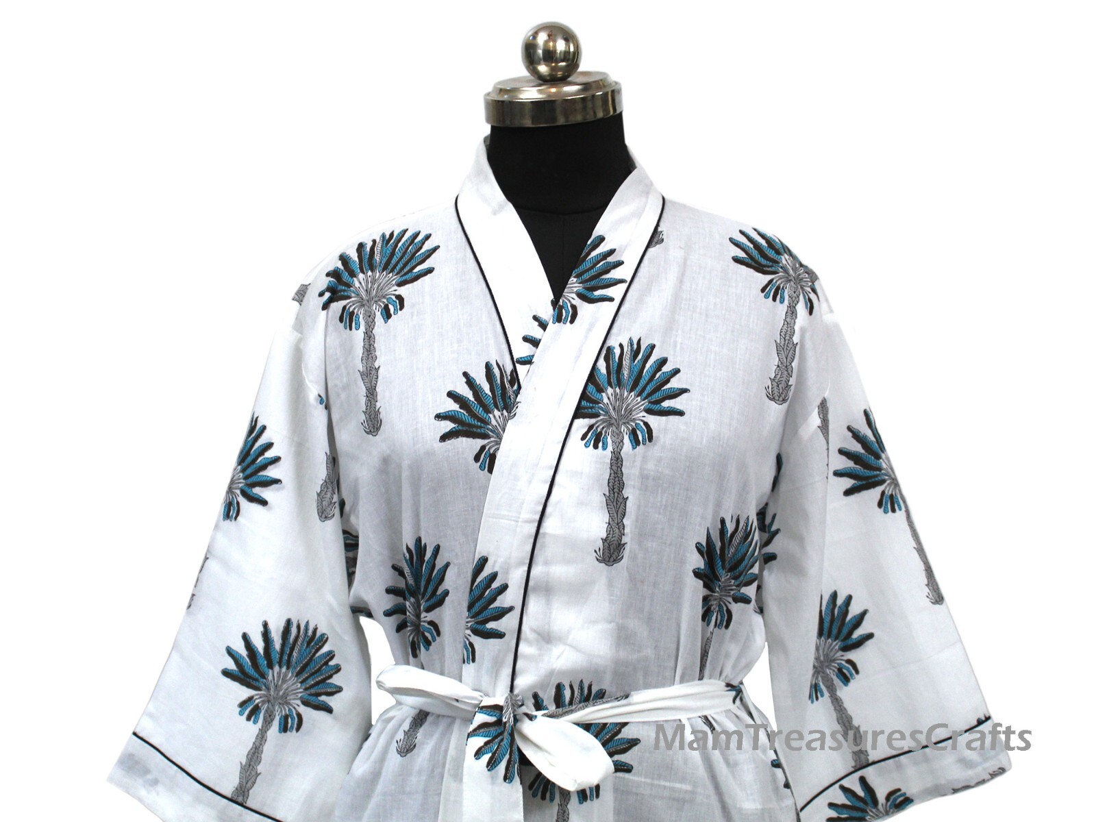 New Indian Palm Tree Print Kimono Bathrobe Beach Wear Robe Bridesmaid Robe