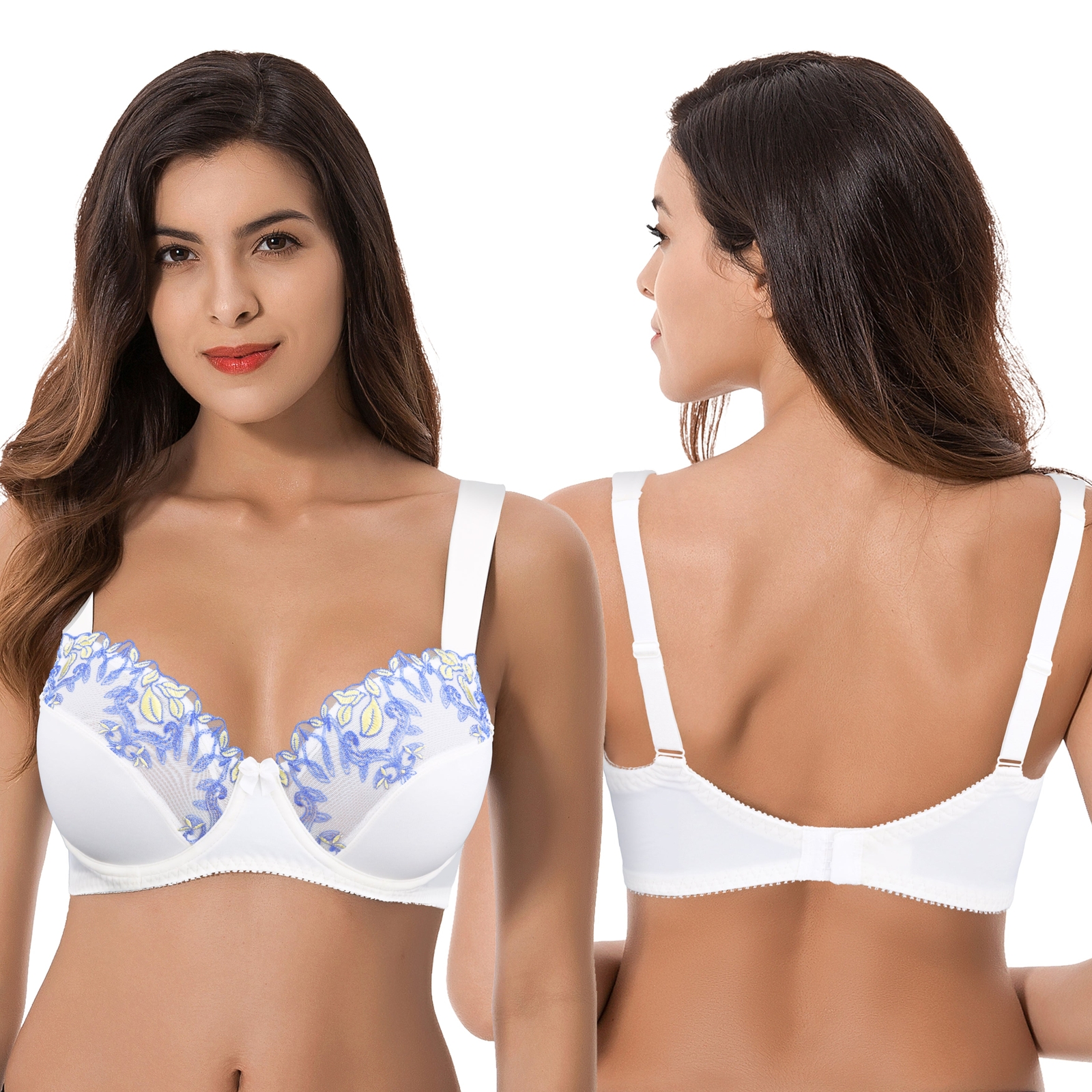 как выглядит Womens Plus Size Minimizer Underwire Unlined Bra with Embroidery Lace-2Pack фото