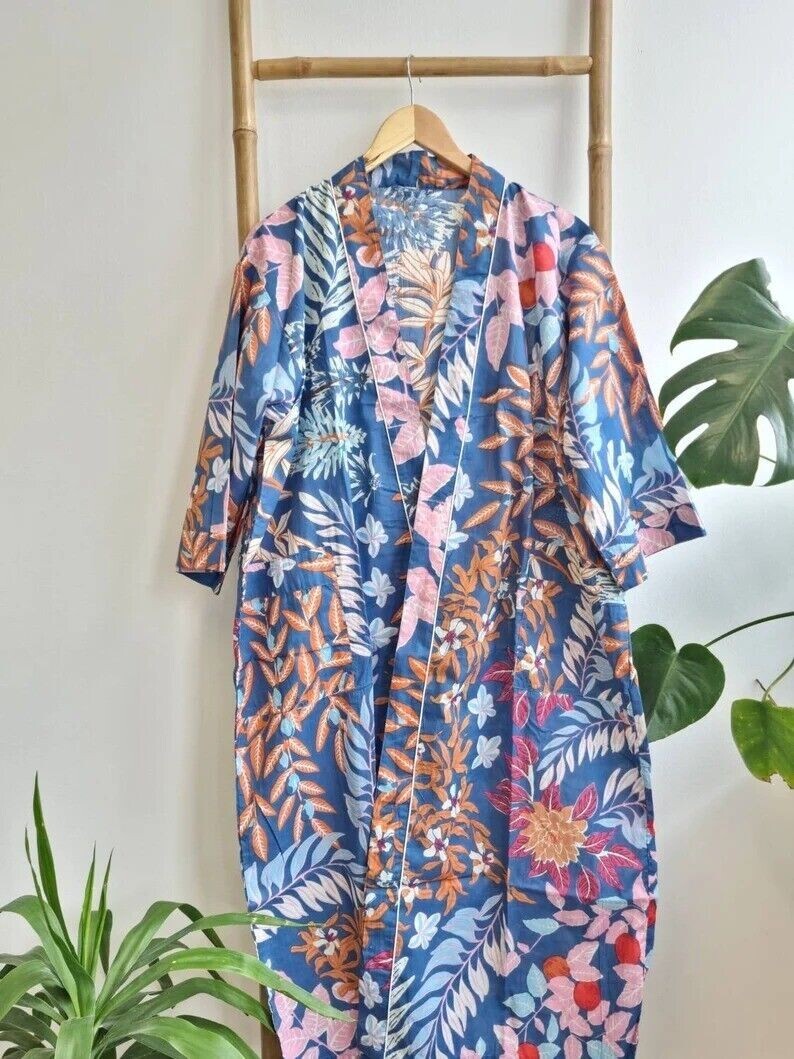Indian Robe Gown Dress Cotton Long Kimono Blue Leaf Floral Women's Nightwear US