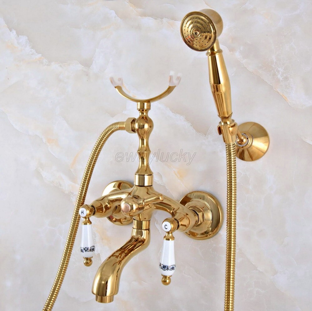 Luxury Gold Color Brass Wall Mount Clawfoot Bathroom Tub Faucet Handheld Shower