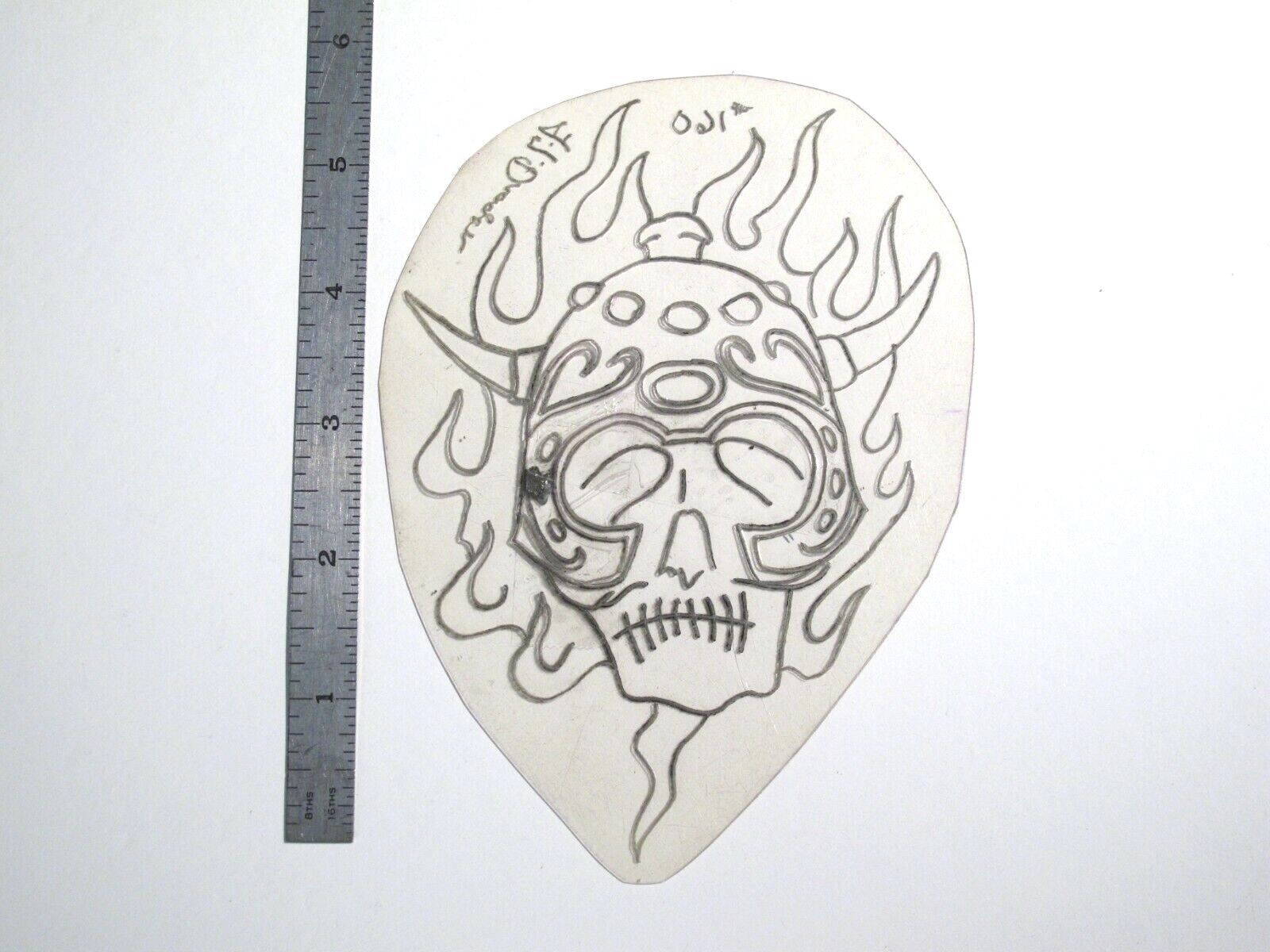 vtg 1960s 1970s Tattoo acetate stencil Flaming Viking Demon Skull signed SK5