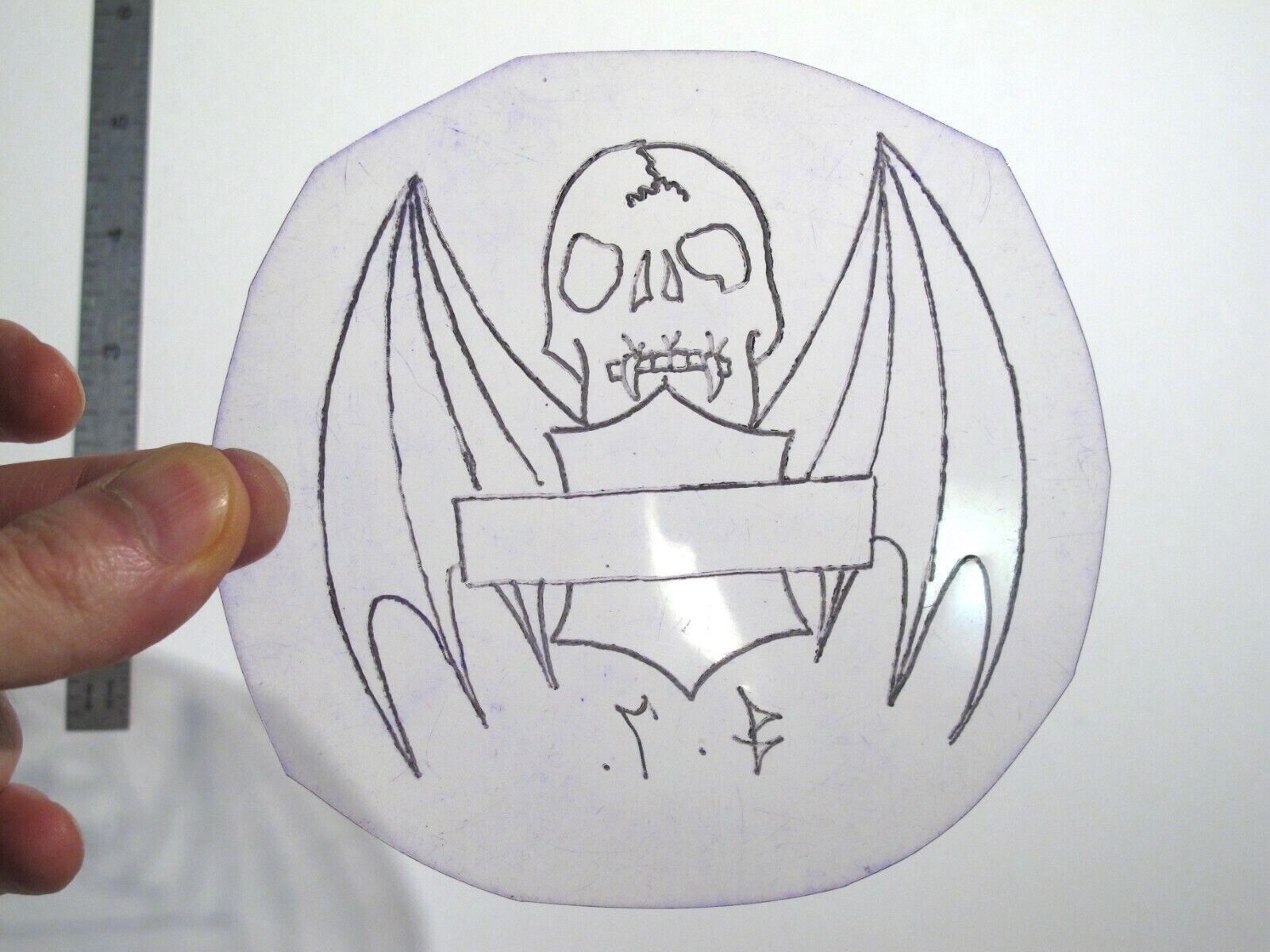 vtg 1960s 1970s Tattoo acetate stencil Fang Skull with Shield signed SK5
