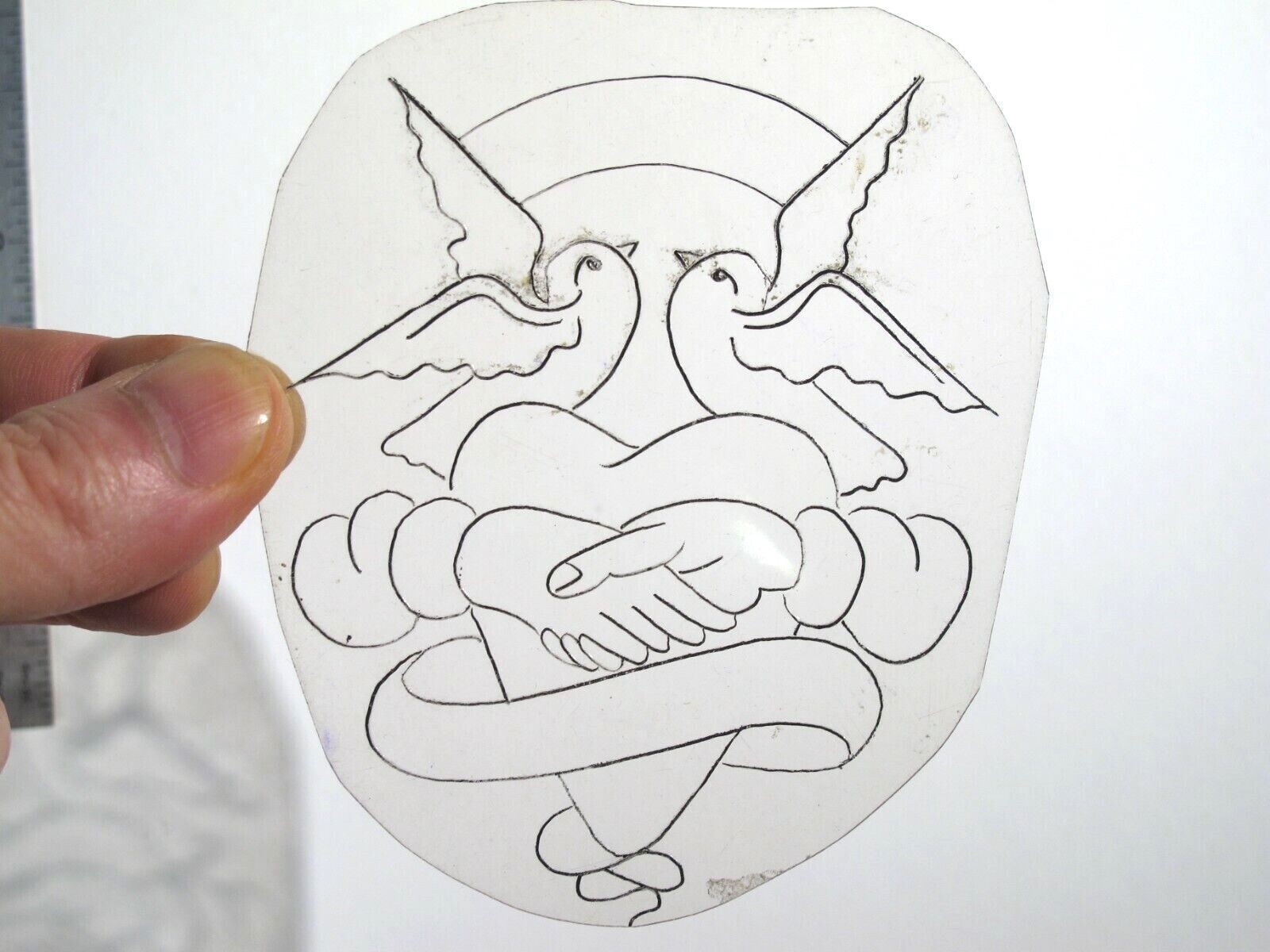 vtg 1960s 1970s Tattoo acetate stencil Shaking Hands Doves and Banner Hippie