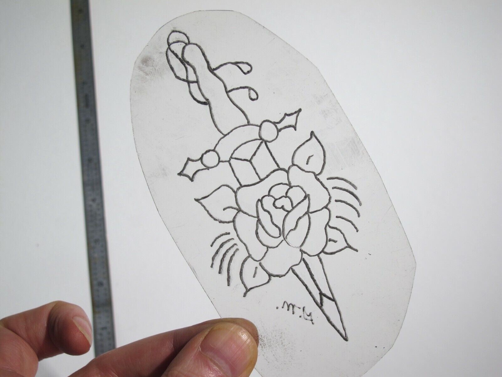 vtg 1960s 1970s Tattoo Flash acetate stencil Sword With Rose signed v3 KN3/4