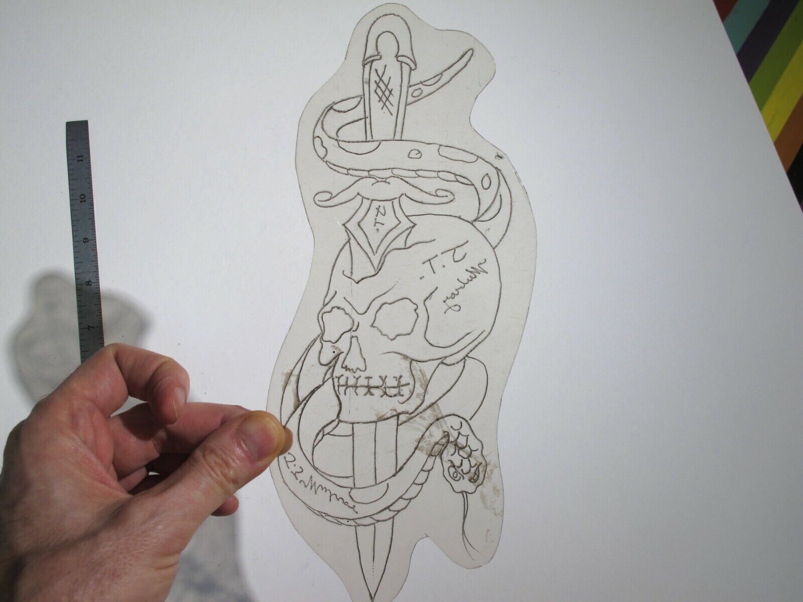 vtg 1960s 1970s Tattoo Flash acetate stencil Skull Snake Sword signed REP2