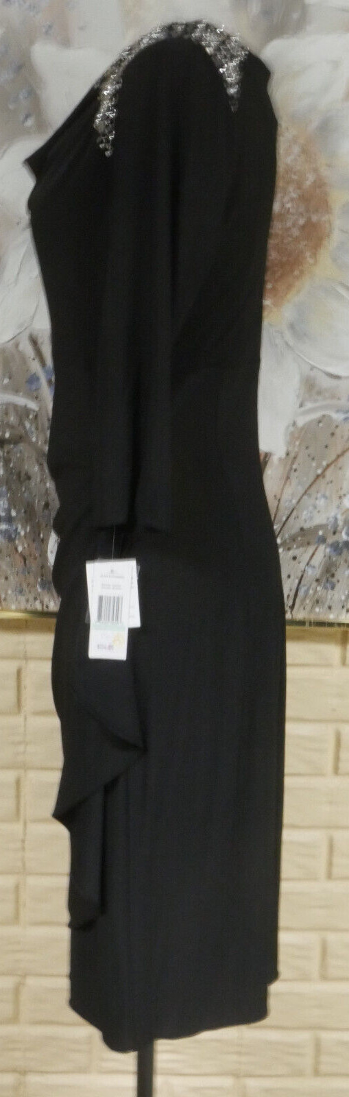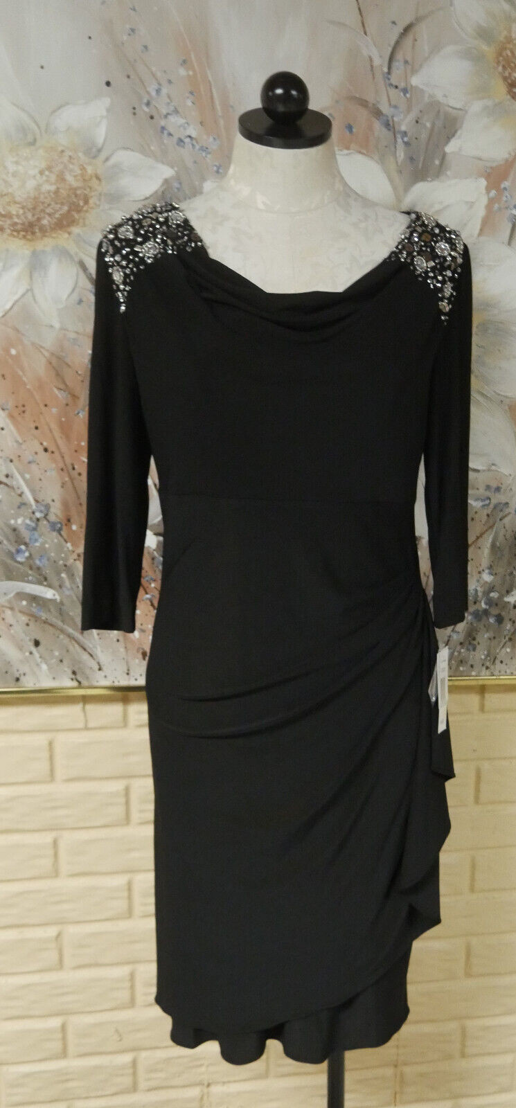 NWT GORGEOUS BLACK ALEX EVENINGS DRESS SZ 8 DRAPING NECK EMBELLISHED SHOULDERS