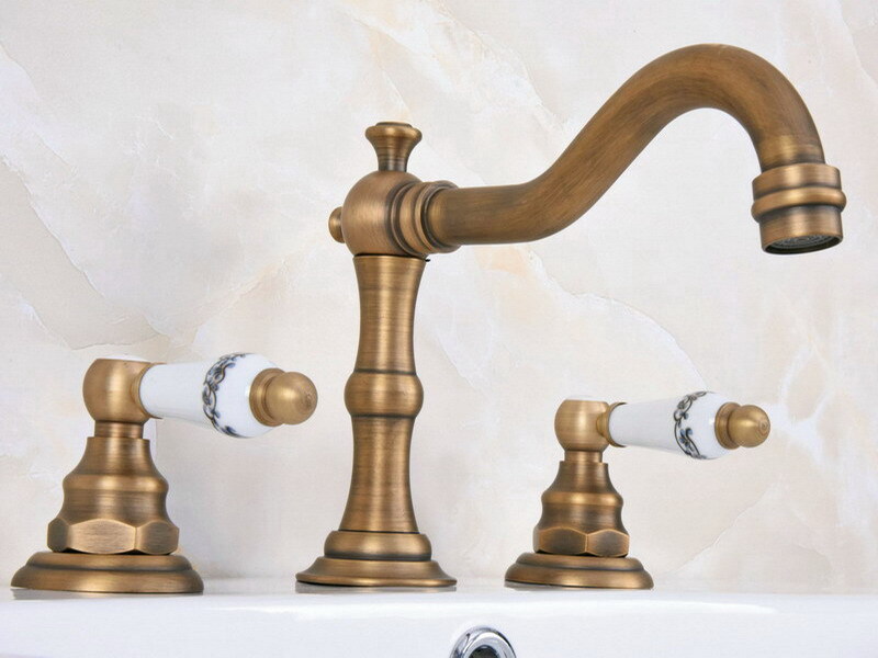 как выглядит Antique Brass Deck Mounted Widespread Bathroom 3 Holes Faucet Water Taps fan072 фото