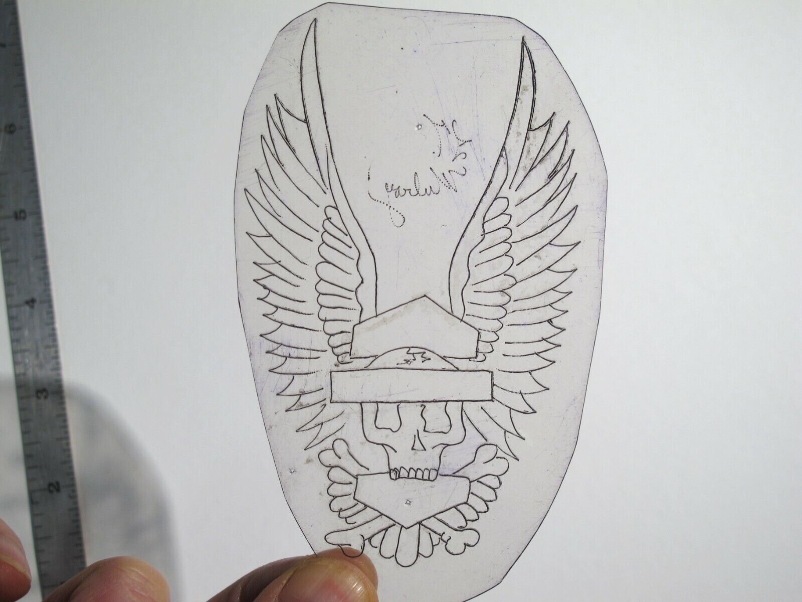 vtg 1960s Tattoo Flash acetate stencil Skull Shield Wings signed HAR2