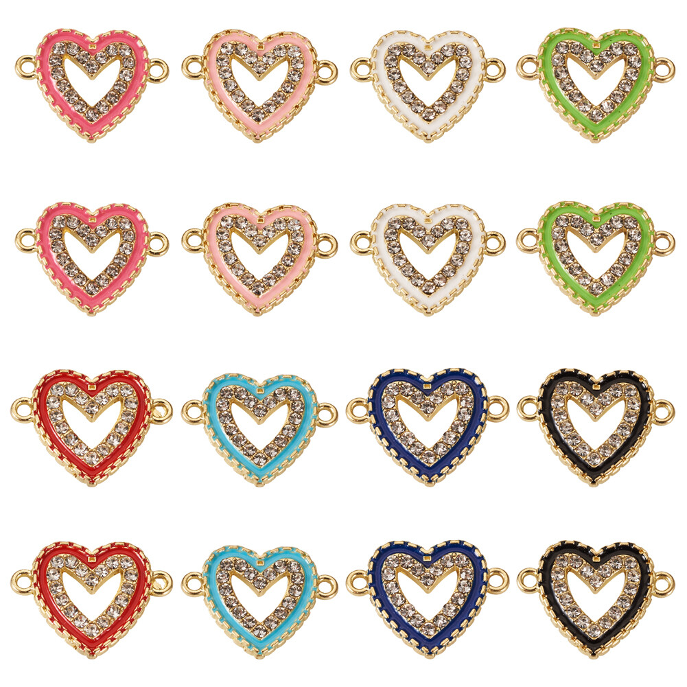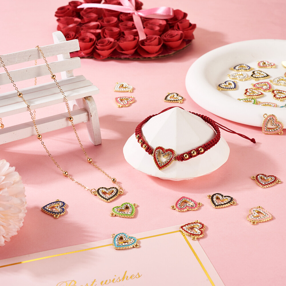 32Pcs Alloy Enamel Connector Charms with Crystal Rhinestone Hollow Heart Links