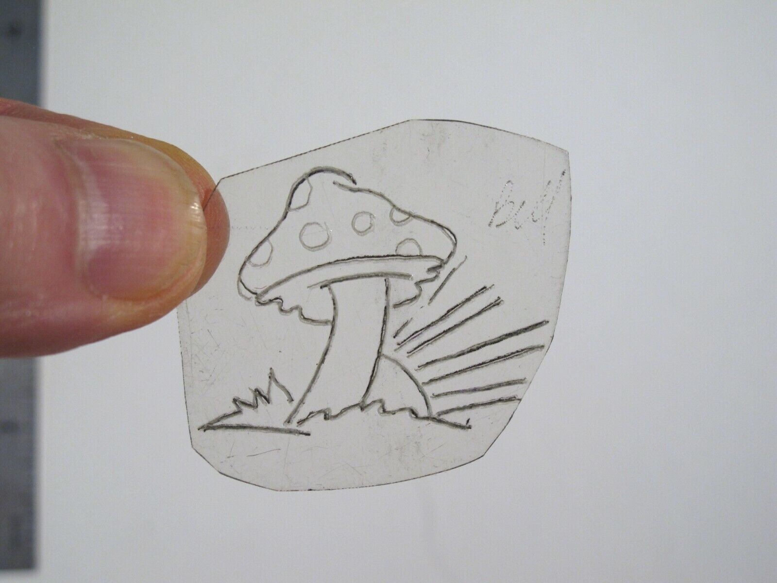 vtg 1960s 70s Tattoo Flash acetate stencil Mushroom and Sunrise signed SHR1