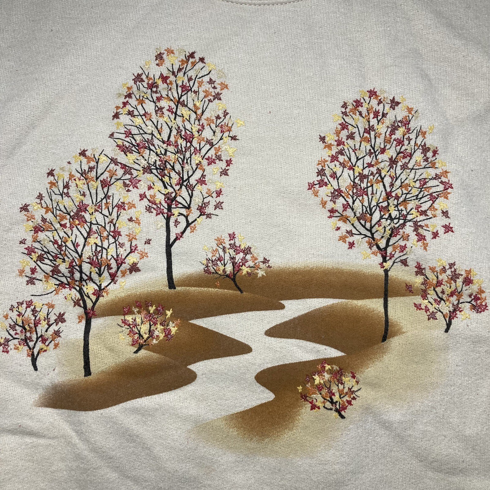 Vintage Autumn Leaves Sweatshirt Size Large Tan JERZEES Trees Nature Print Crew