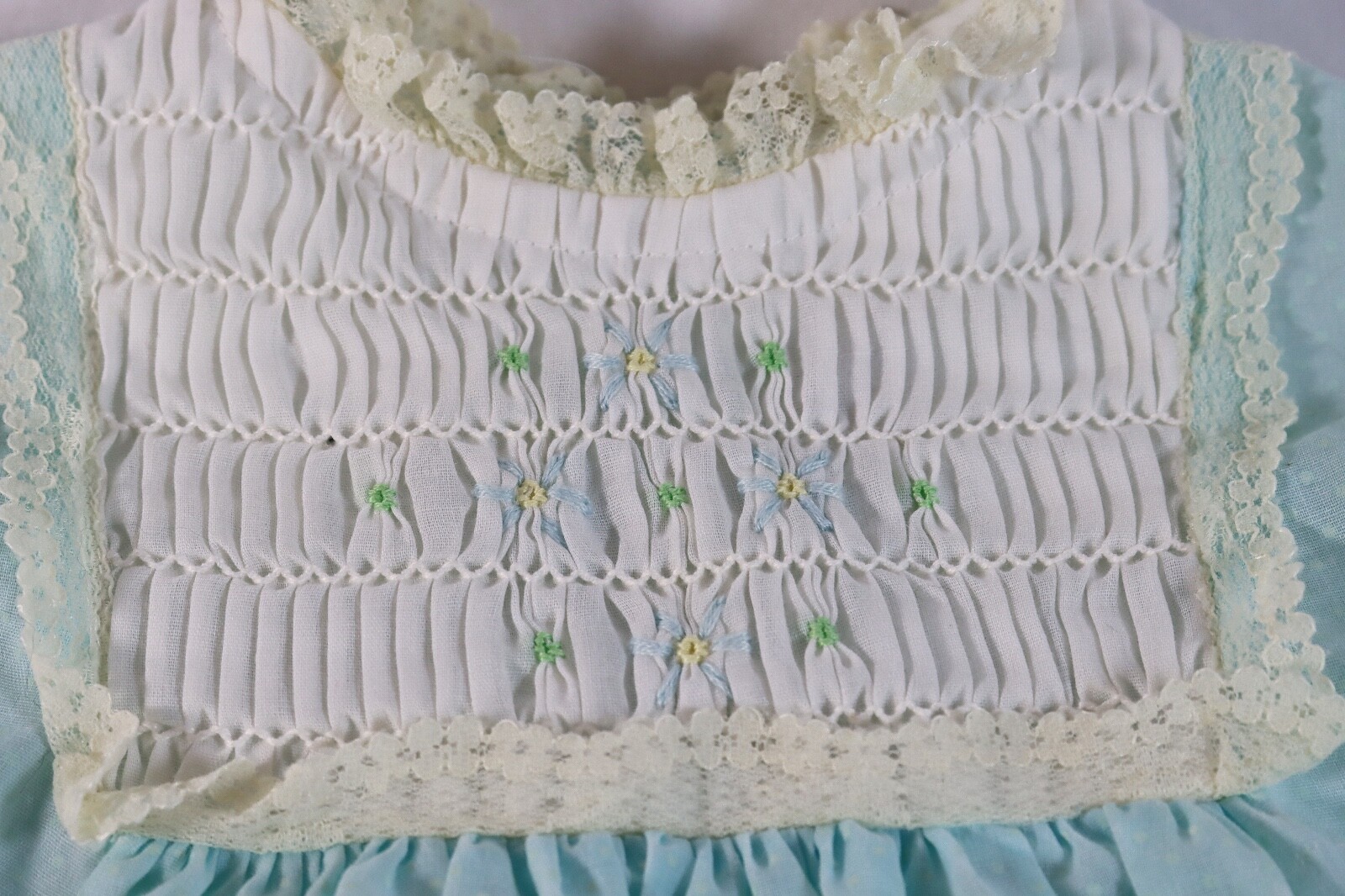 Vintage POLLY FLINDERS Light Blue Hand Smocked Dress Baby Size 12 mo Child 1950s