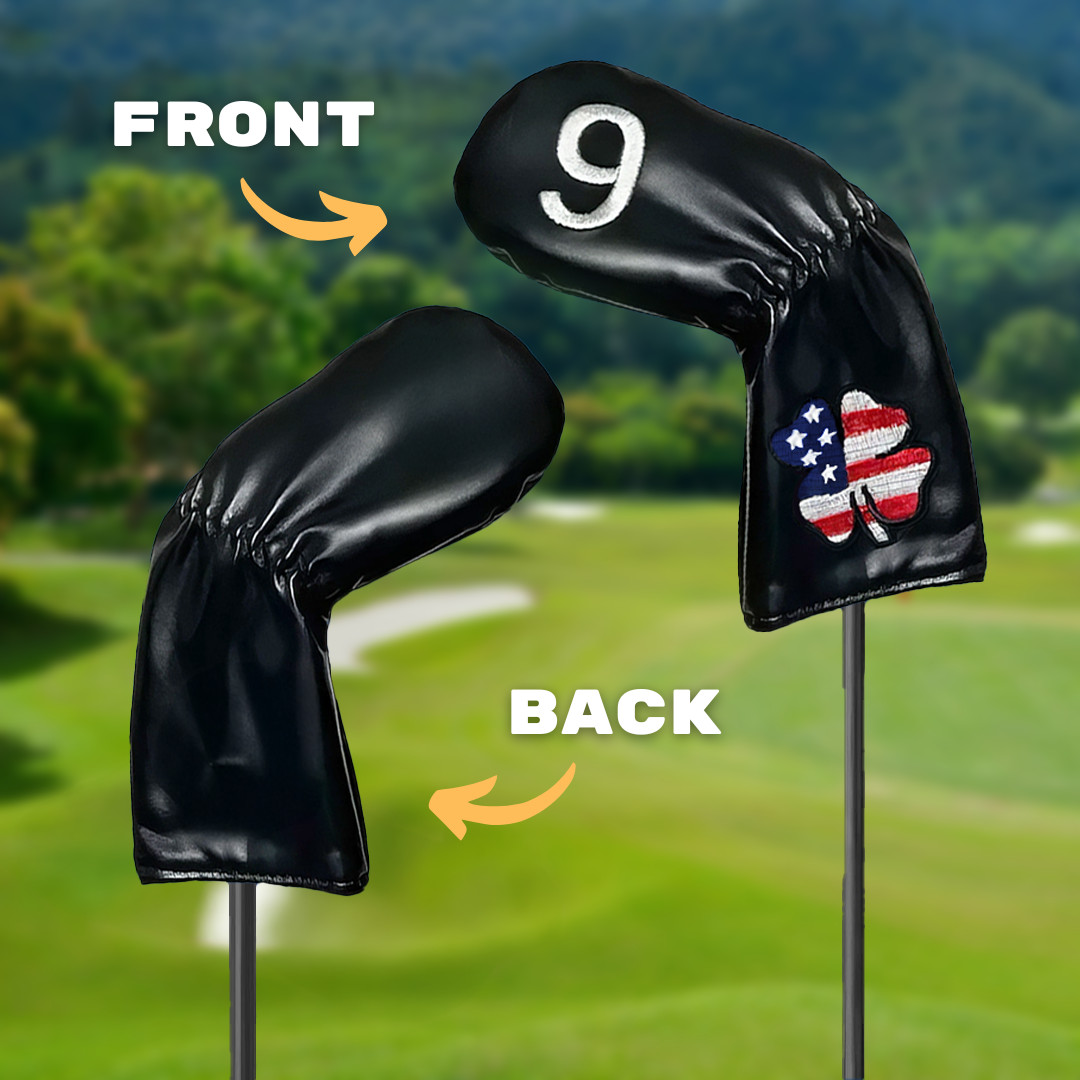 11pc Set Black Golf Iron Head Covers with USA Red-White-Blue Clover-Shamrock NEW