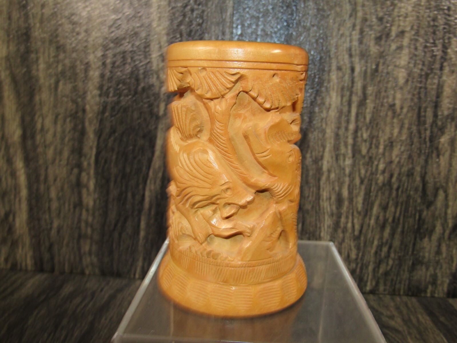 как выглядит Vintage Hand Carved Wood 4"Cup Pencil Container Wild Animal Elephant Lion Jungle фото