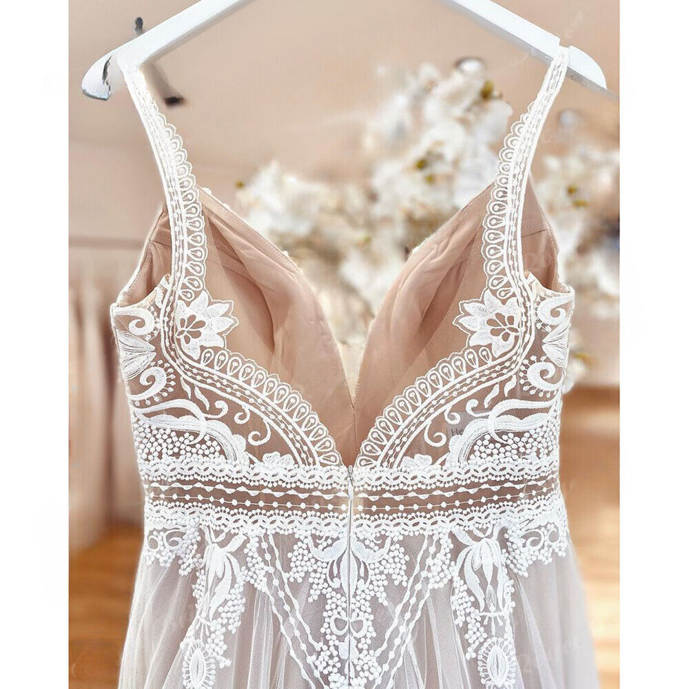 Boho A-Line Wedding Dresses V-Neck Backless Lace Applique Beach Bridal Gowns