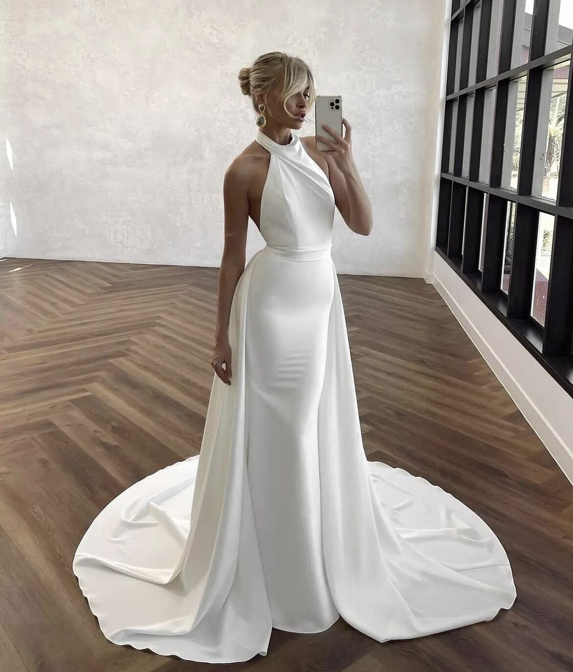 Halter Mermaid Wedding Dresses with Detachable Train Satin Elegant Bridal Gowns