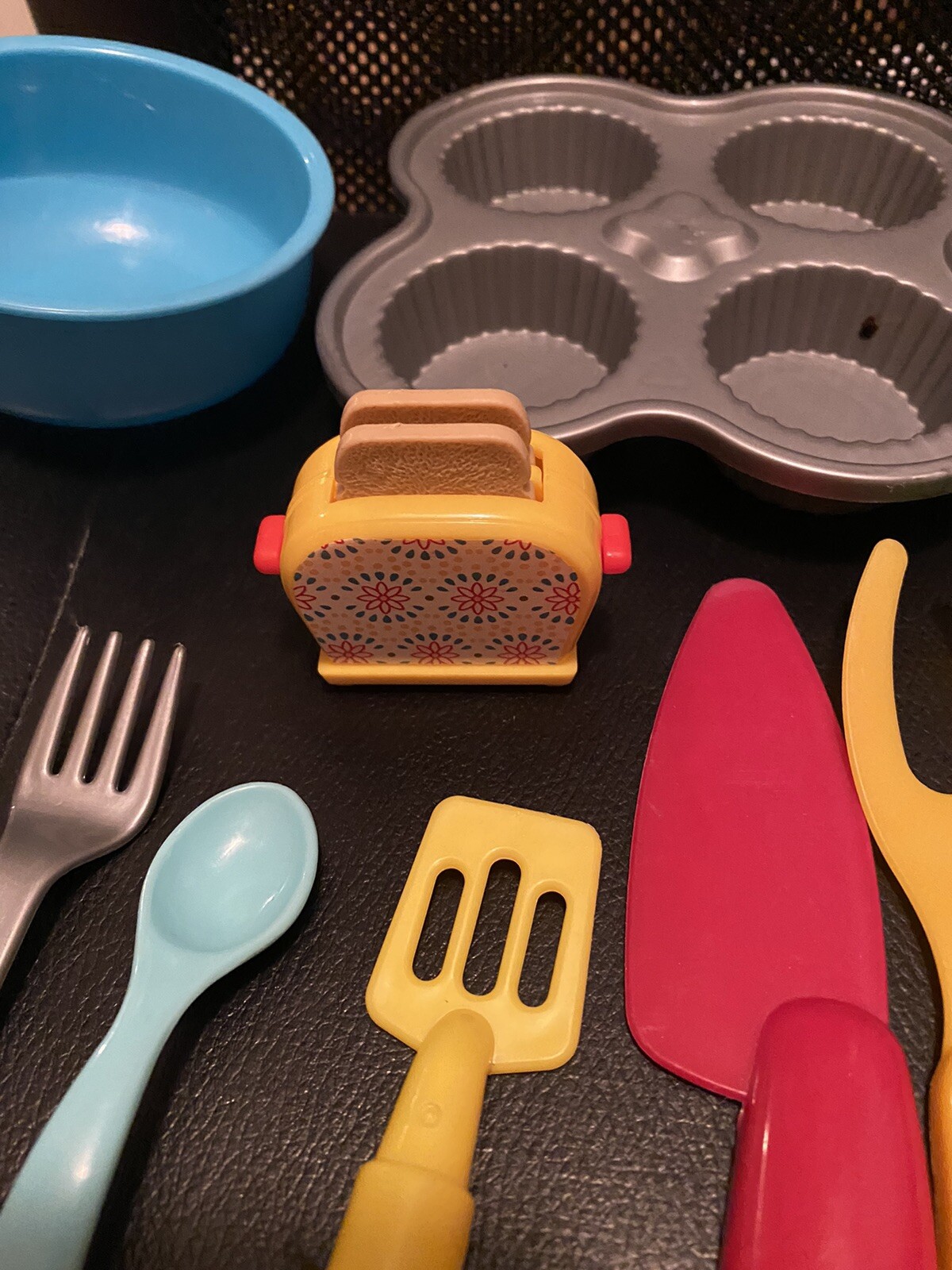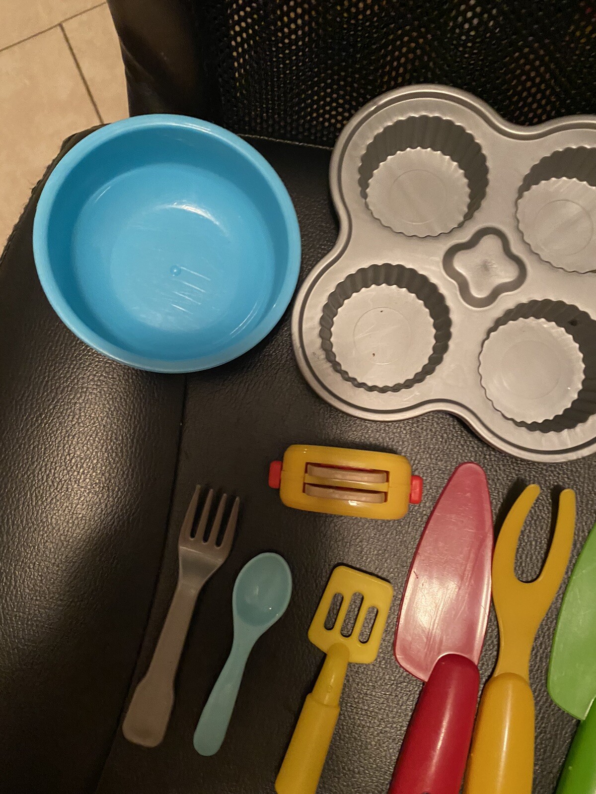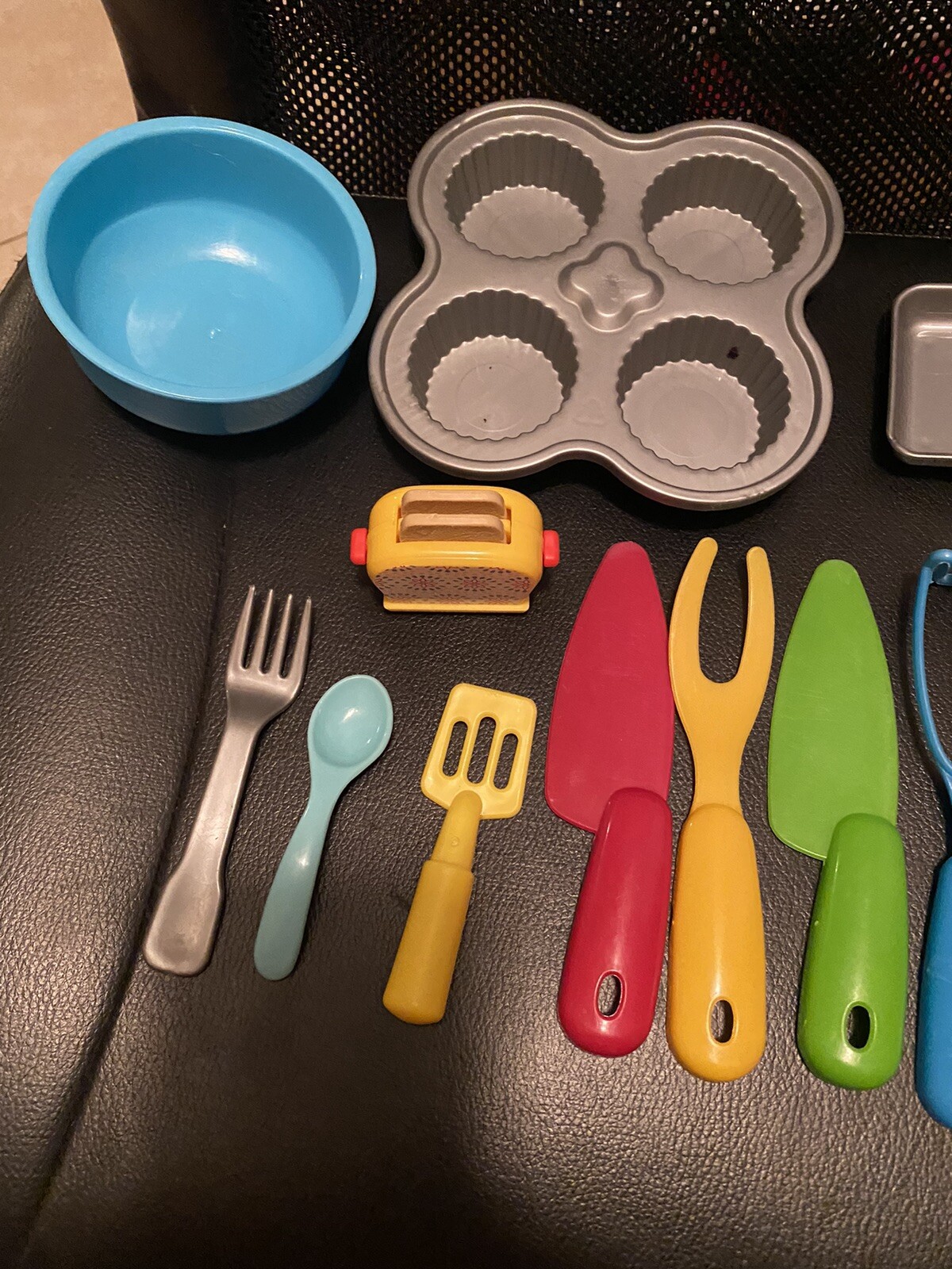 как выглядит Mixed Lot of 13 Play Pretend Plastic Dishes Toys Fork Dishes Pans Bowl Toaster фото