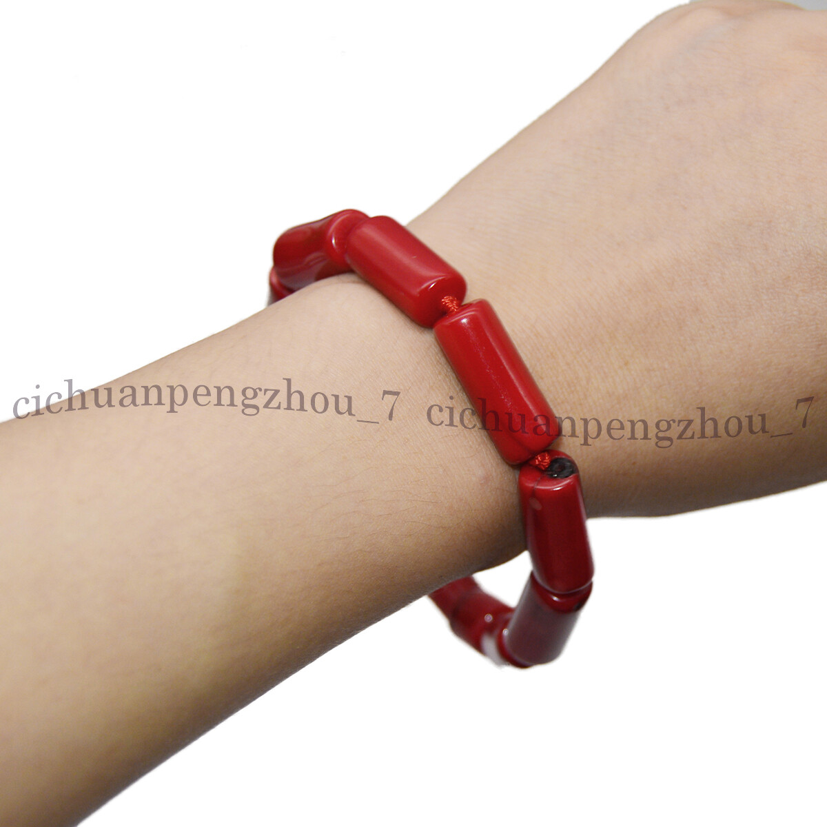 Natural Red Coral Gemstone Cylinder Column Barrel Beads Bracelet 8-9''