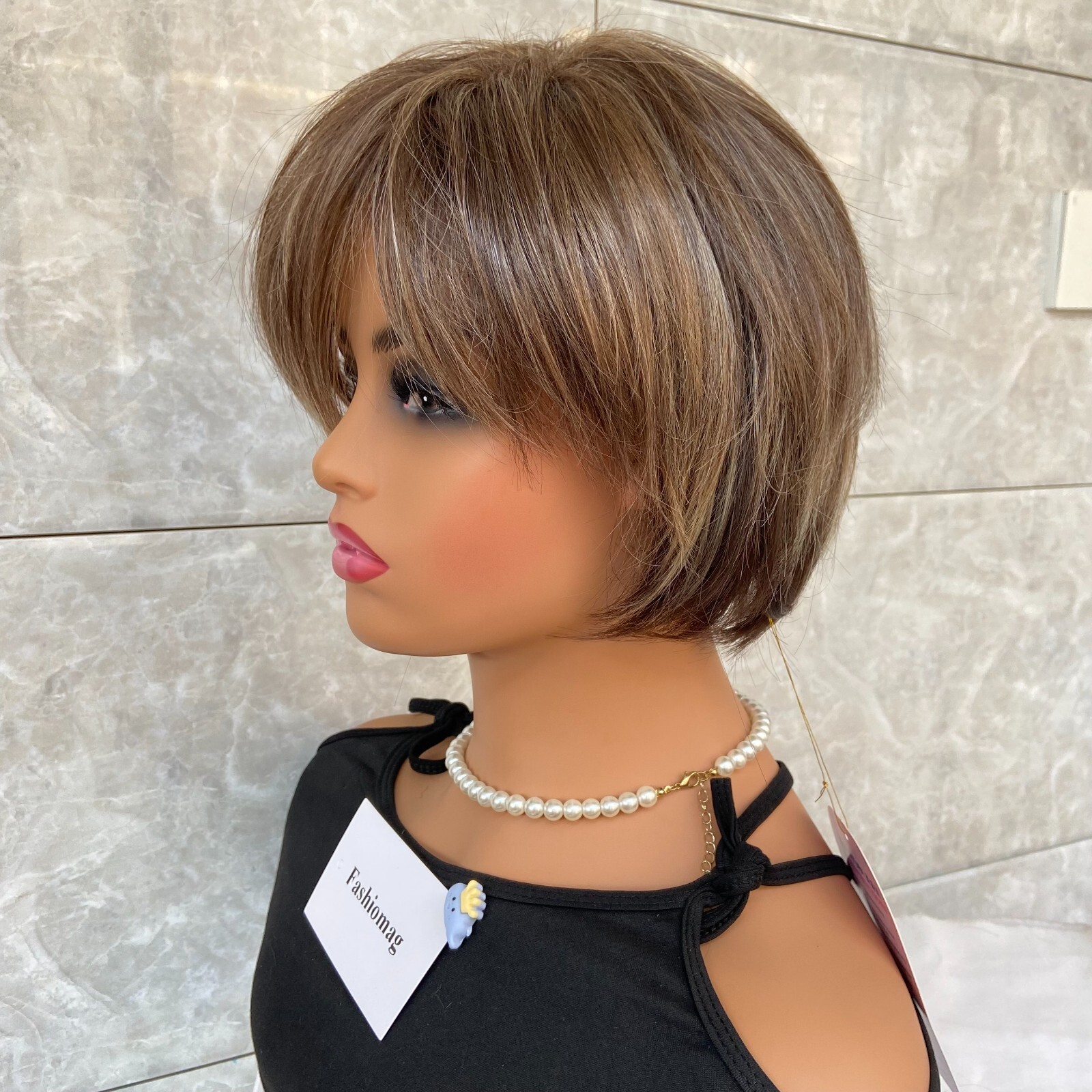 Short Bob Brown Mix Human Hair Blend Heat Ok Wigs Women Soft Natural
