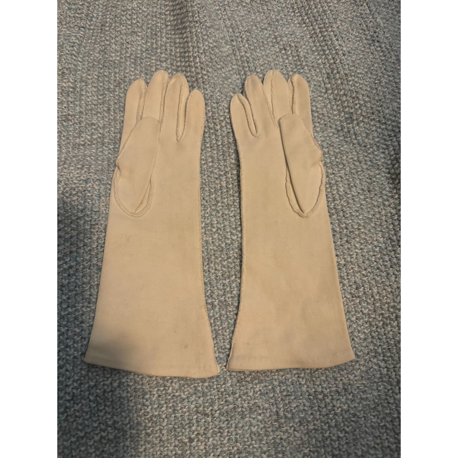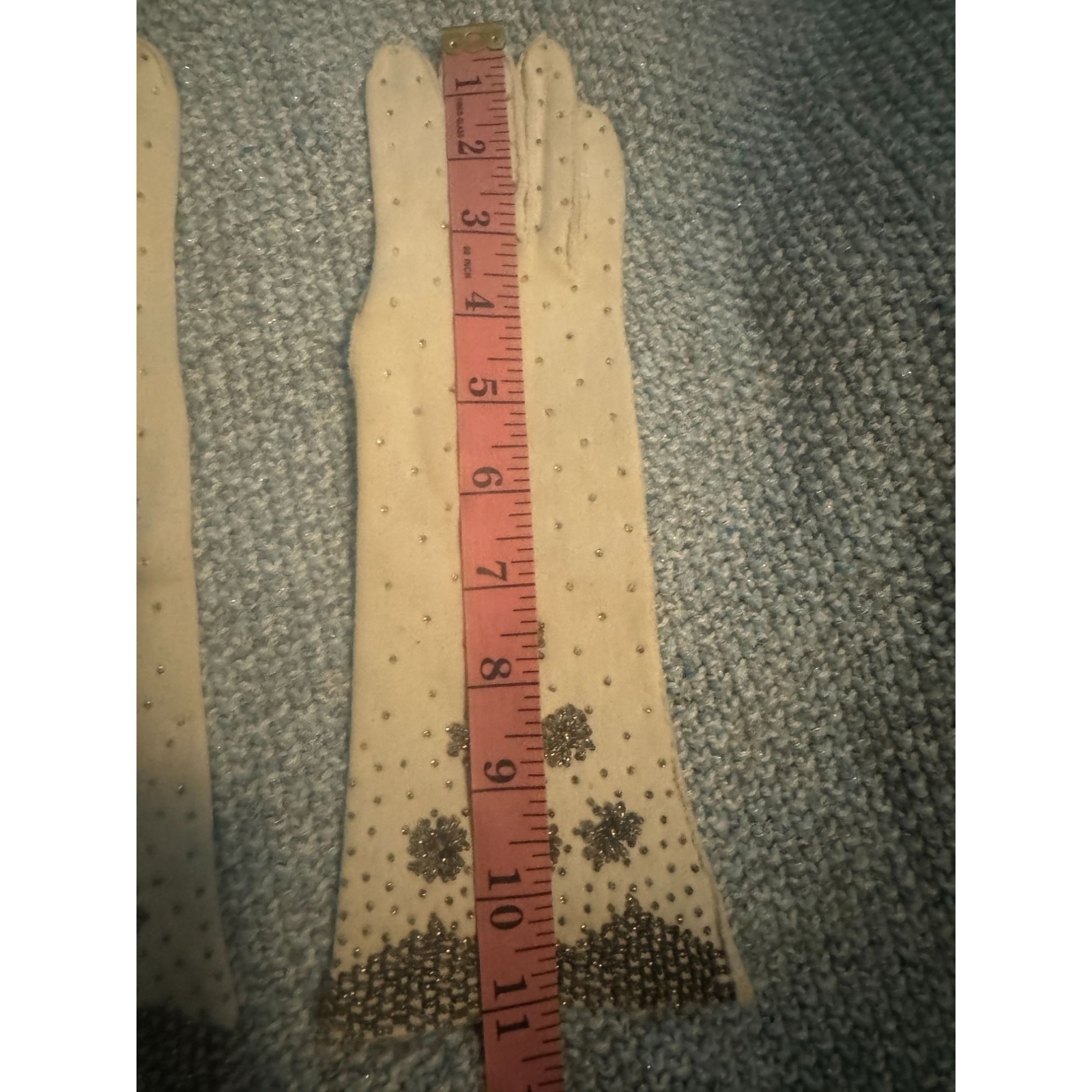 как выглядит Vintage Beaded White Cotton Gloves Silver Metallic Flowers Small фото