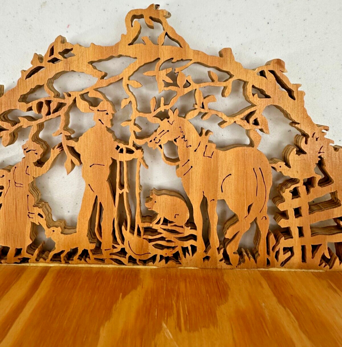 Handcrafted Fretwork Wall Shelf Light Woodtone Cutwork Farmland Country Scene