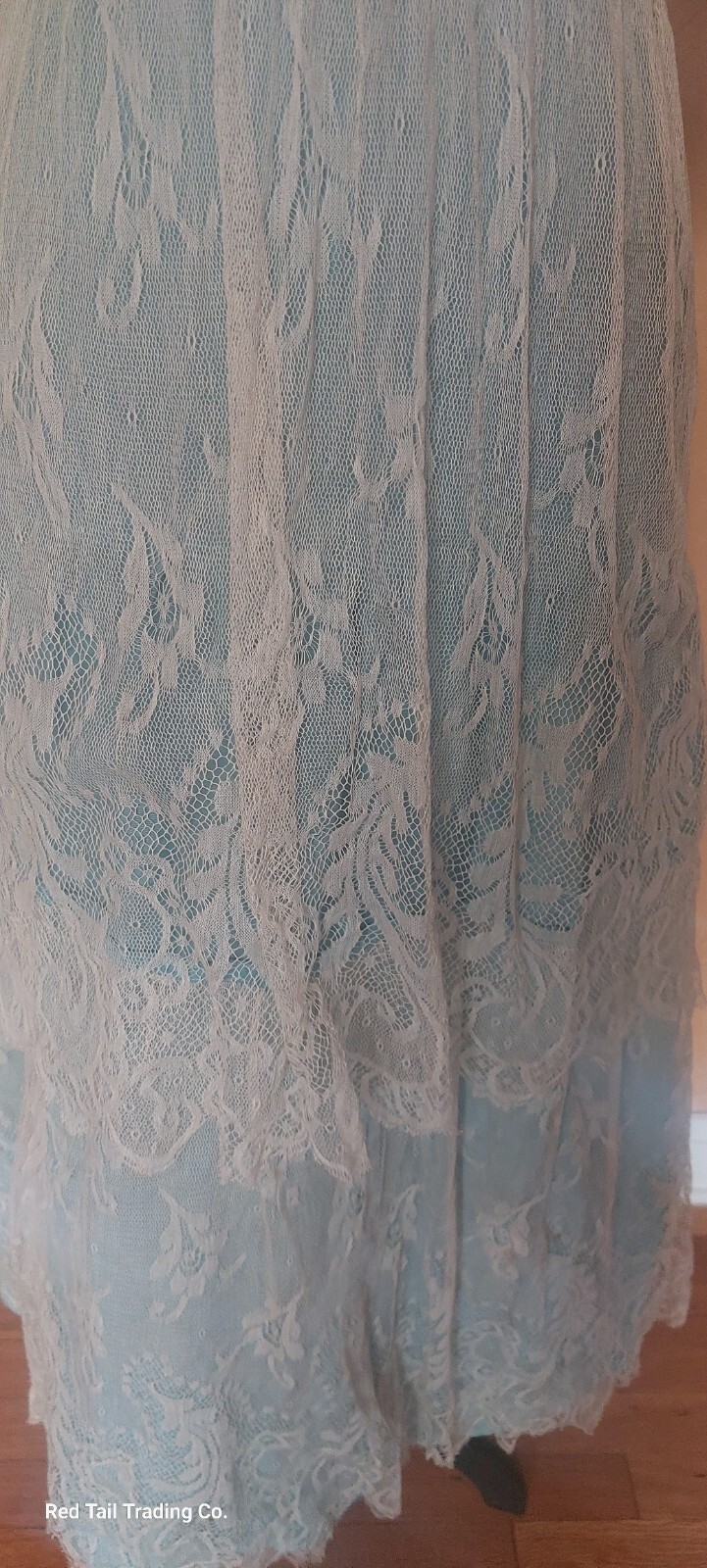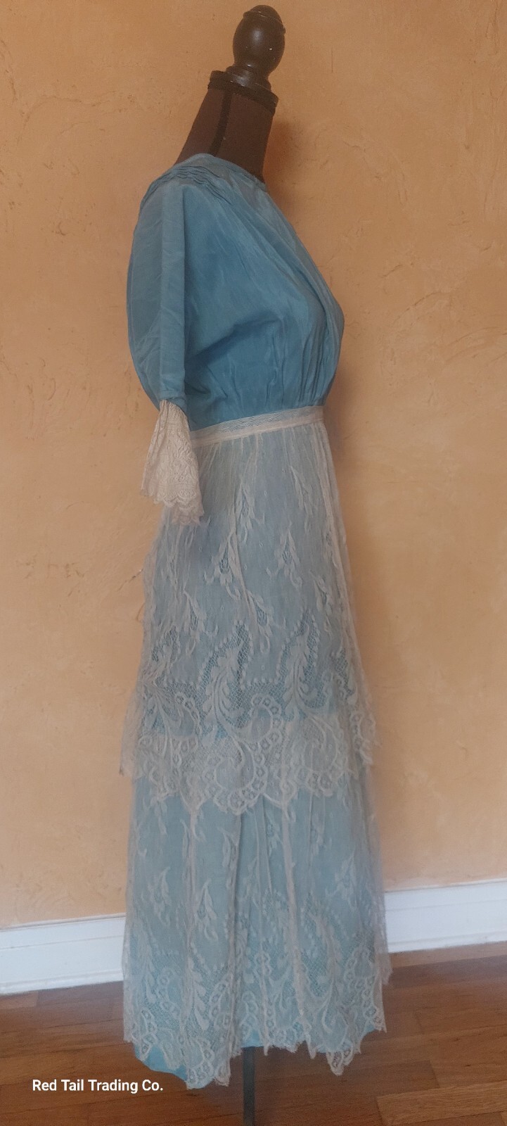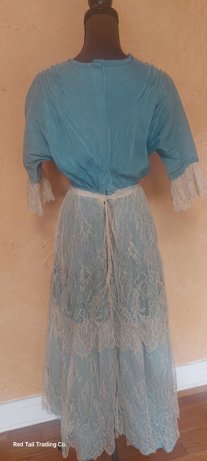 как выглядит Beautiful Edwardian Teal Silk Dress W/ Intricate Lace Overlay And Sleeves Sm фото