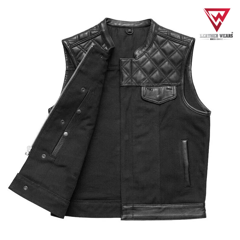 Black Leather Men's Waistcoat Diamond Stitch Motorbike Motorcycle Concealed Vest