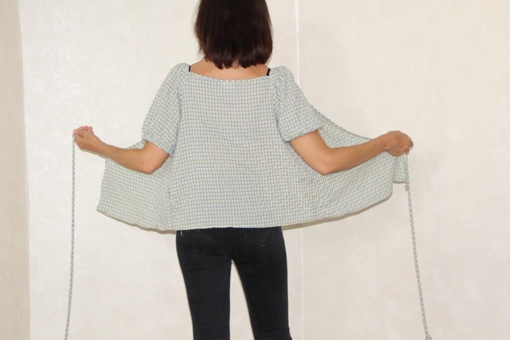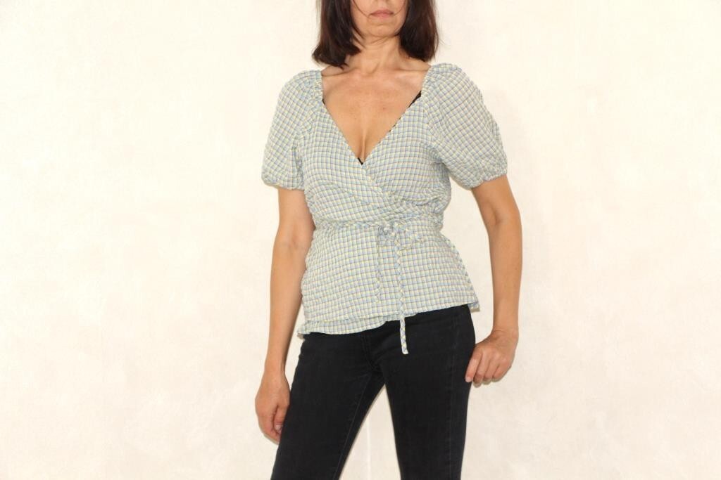 как выглядит Vintage V- neck wrap top, Short sleeve plaid blouse, Retro paisley shirt, M фото
