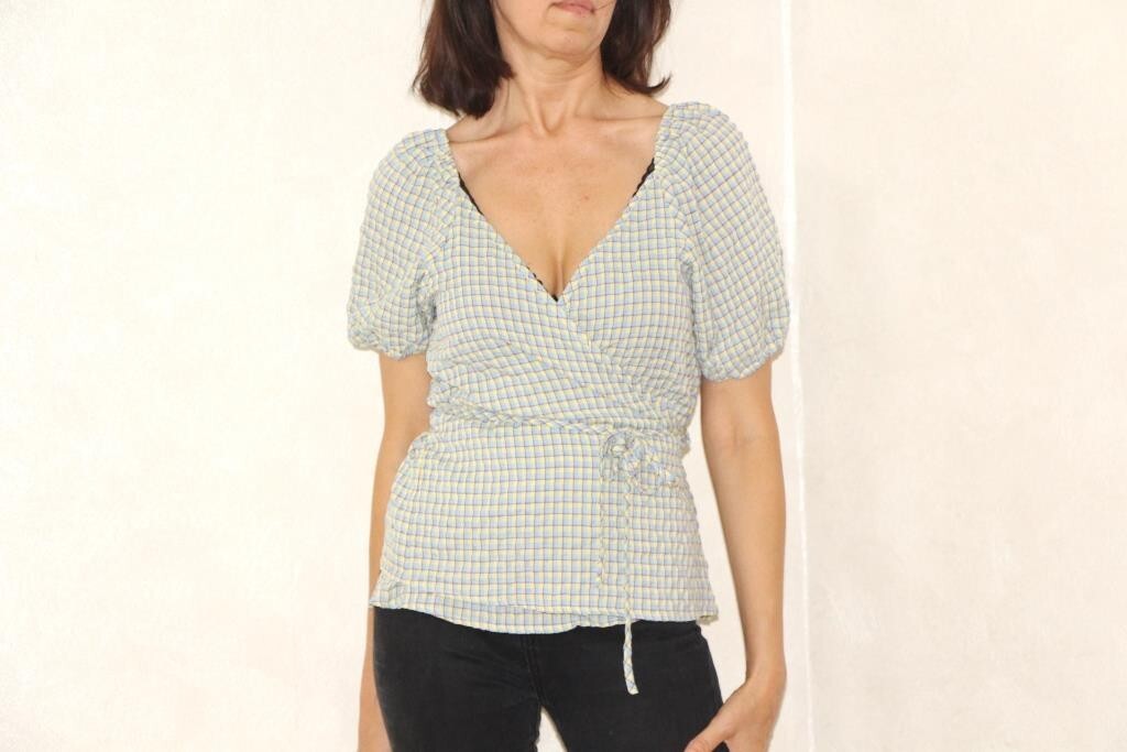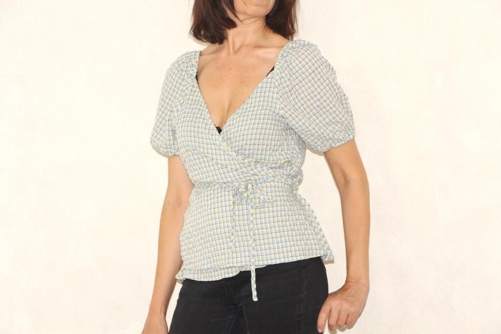 Vintage V- neck wrap top, Short sleeve plaid blouse, Retro paisley shirt, M