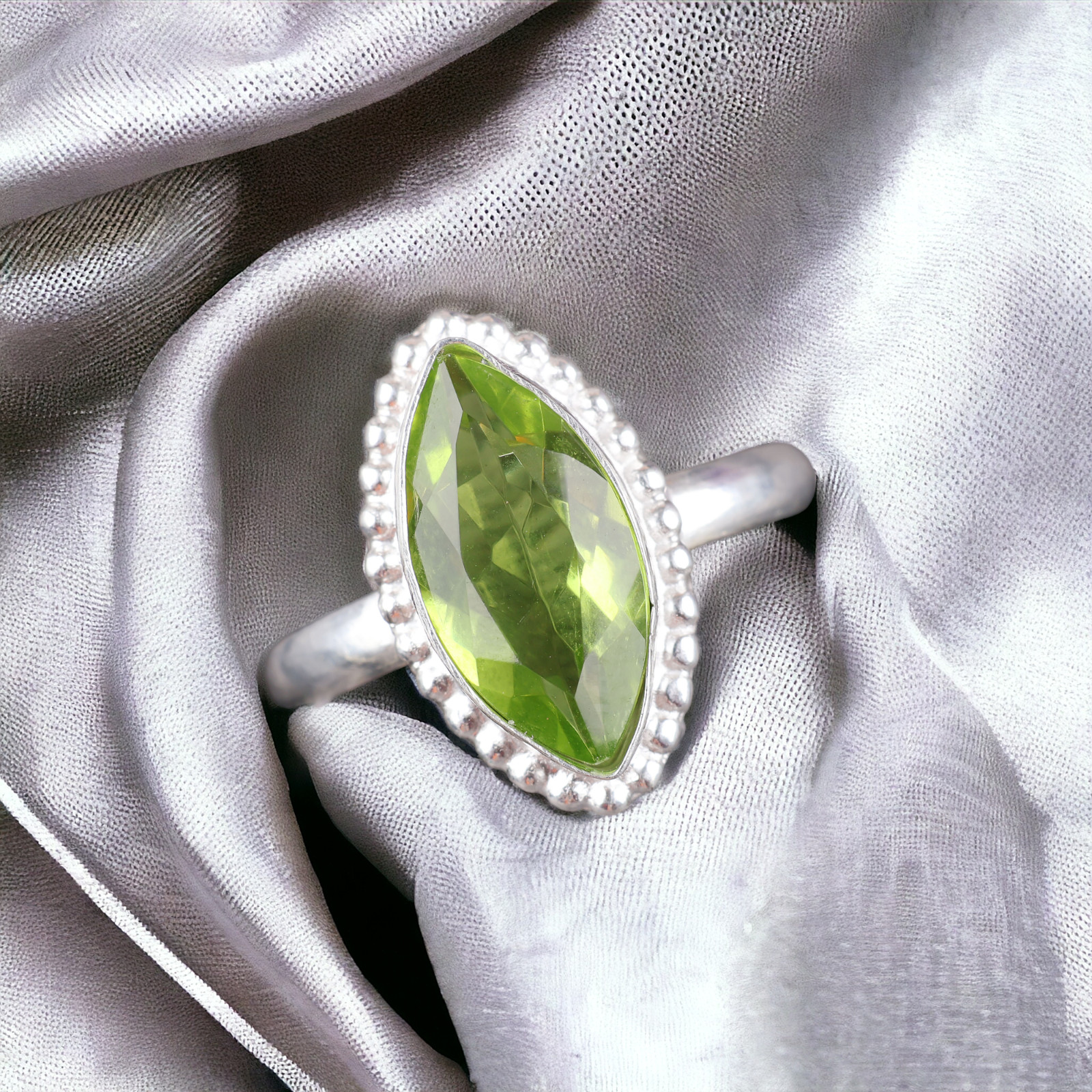 как выглядит Natural Peridot Gemstone 925 Sterling Silver Ring Green Filigree Marquise Ring. фото