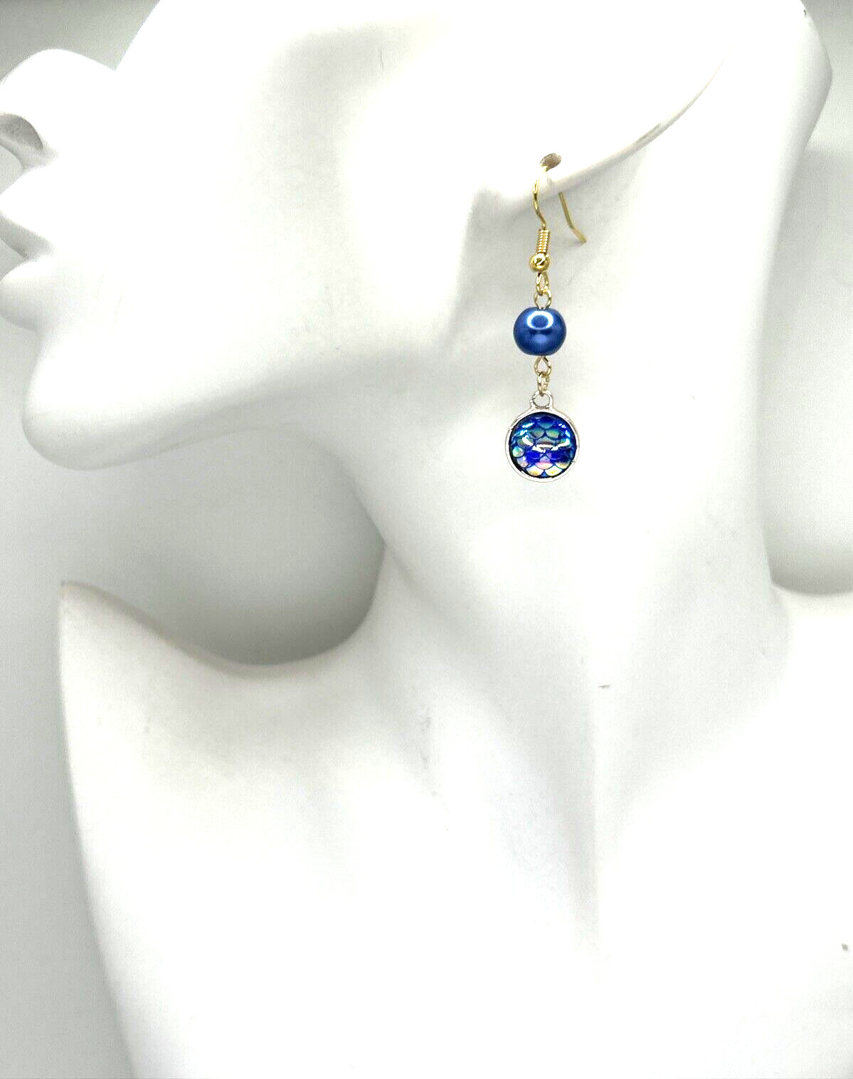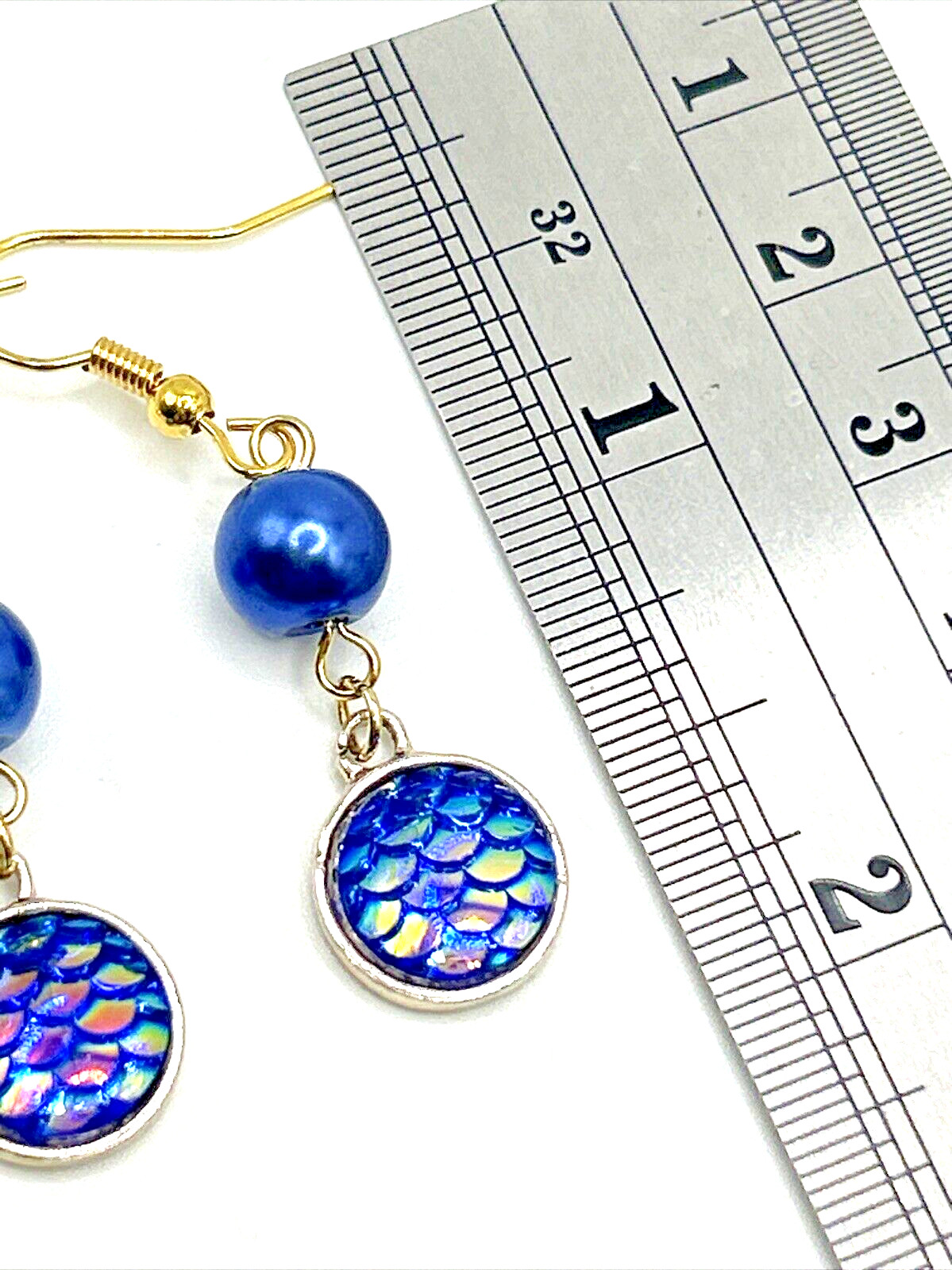 Blue Mermaid 3-D Resin Multi-Color Fish Scales Dangle Drop Earrings Glass Beads