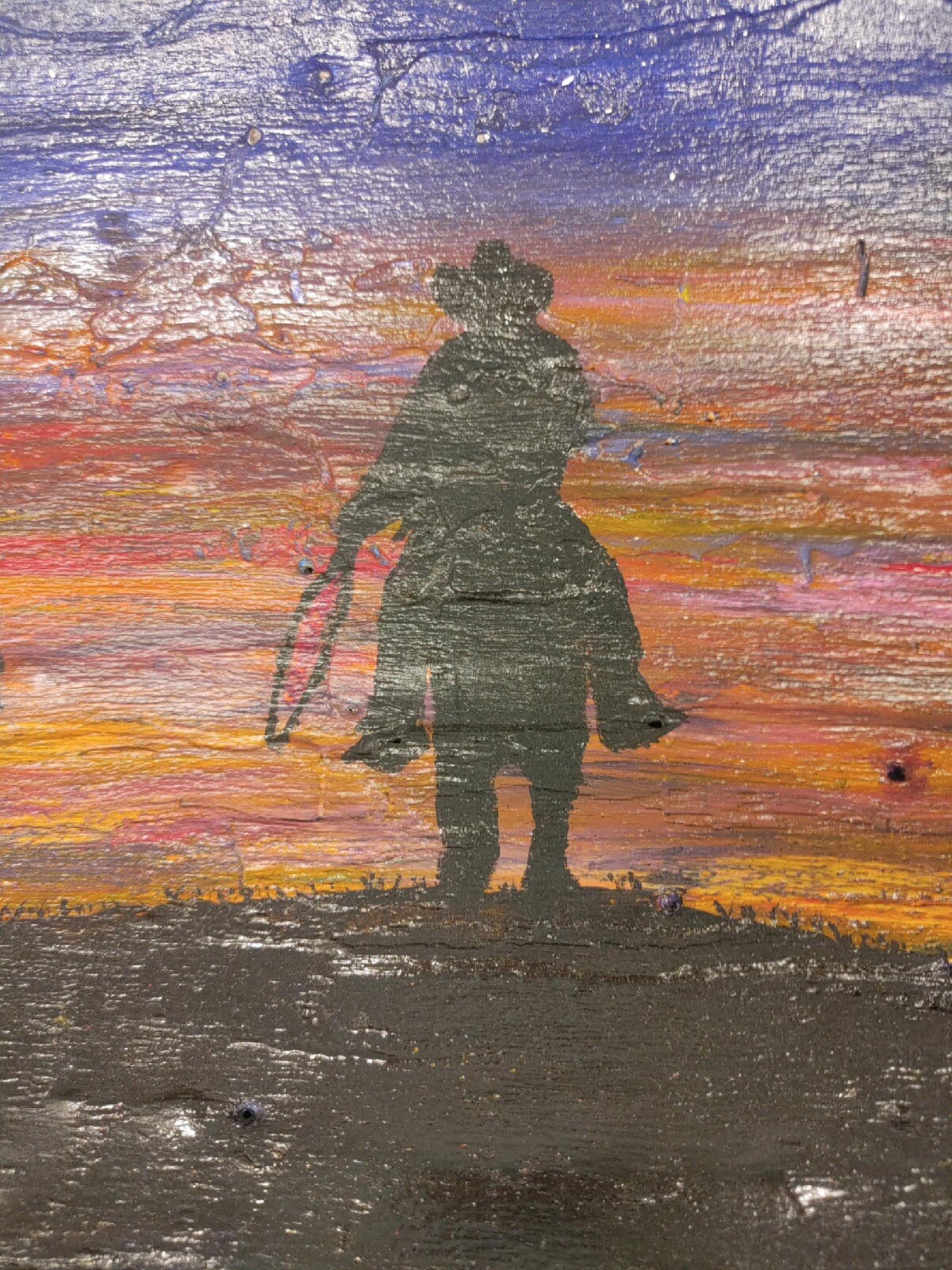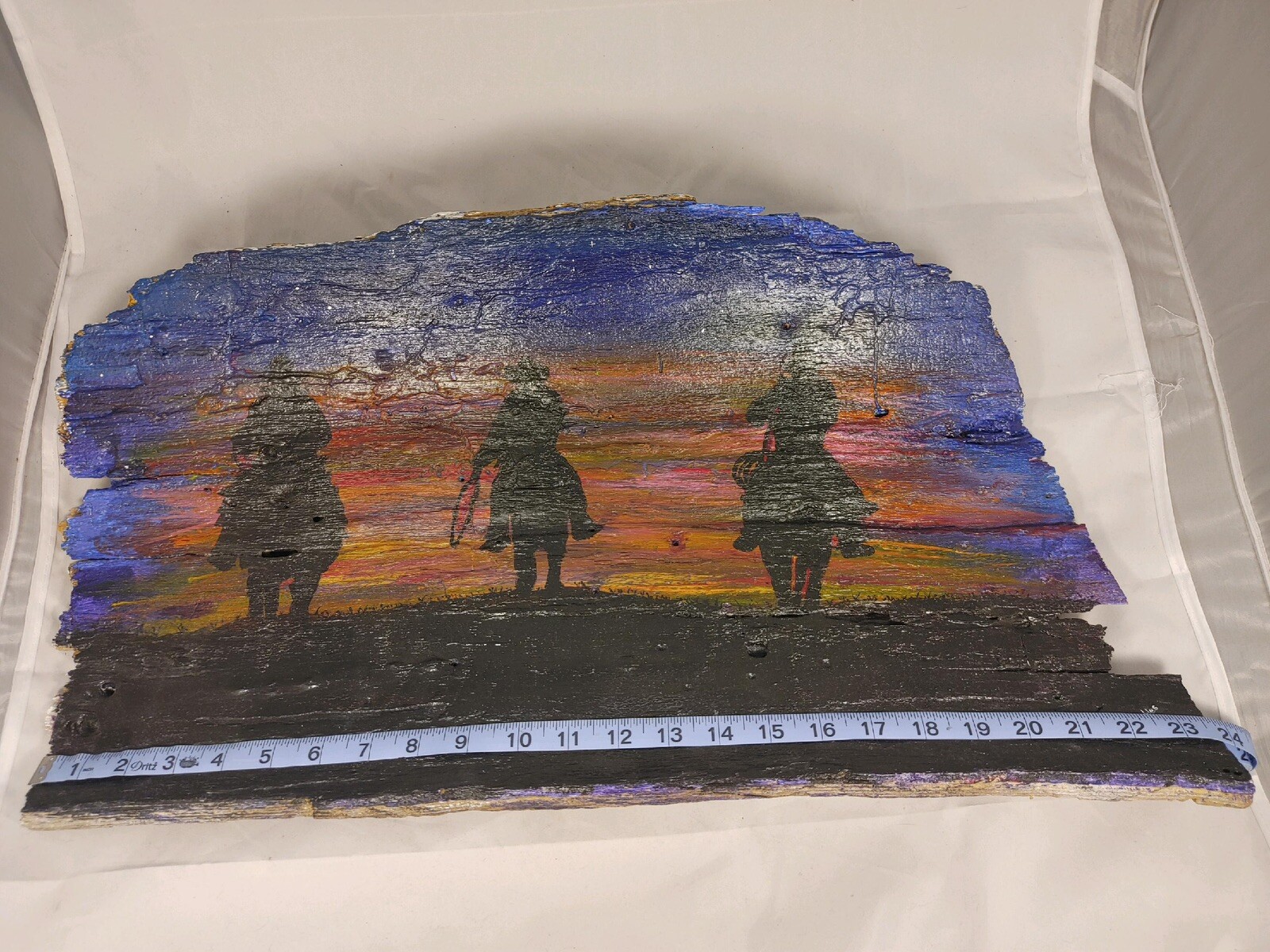 как выглядит Hand Painted Tree Bark Western Nature Art Signed By Artist 3 Cowboys At Sunset фото