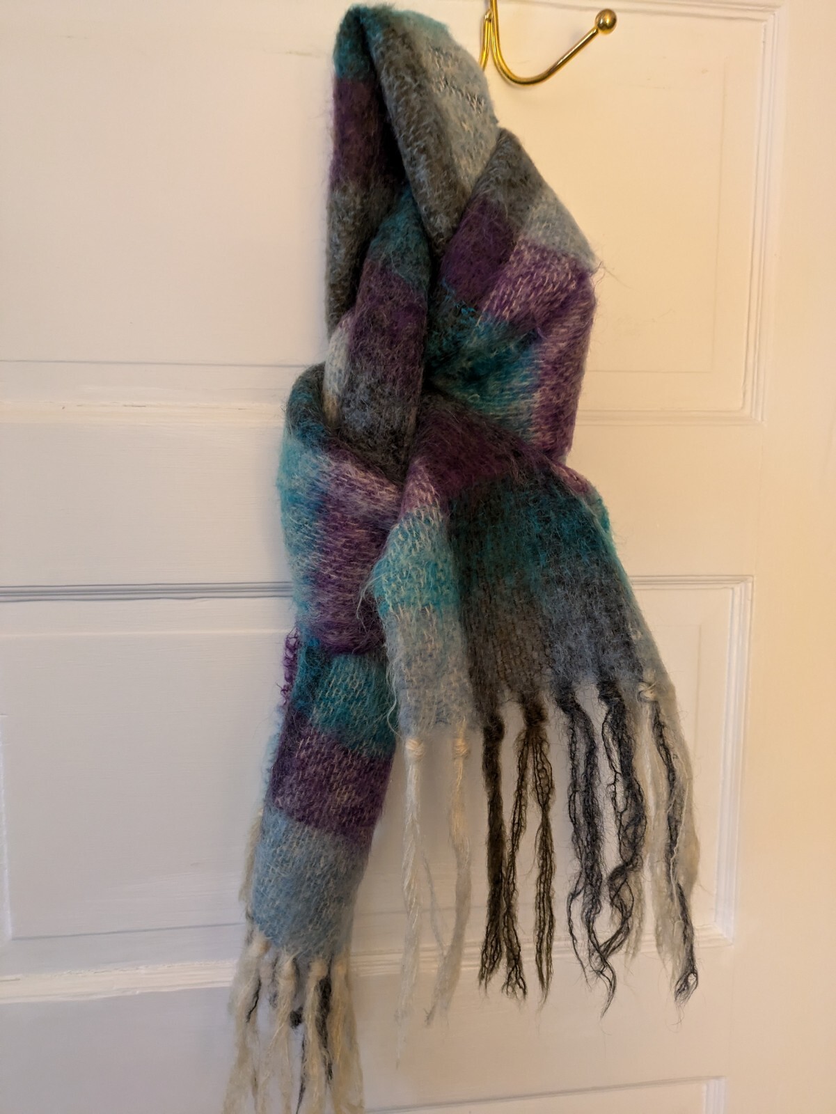Bonwit Teller VTG Turq, Plum, Beige, Brown Plaid Mohair/ Wool Scarf 72L HOLE
