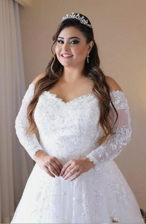 Elegant Lace Beads Sequins Wedding Dress Plus Size Bridal Gown with Long Sleeves
