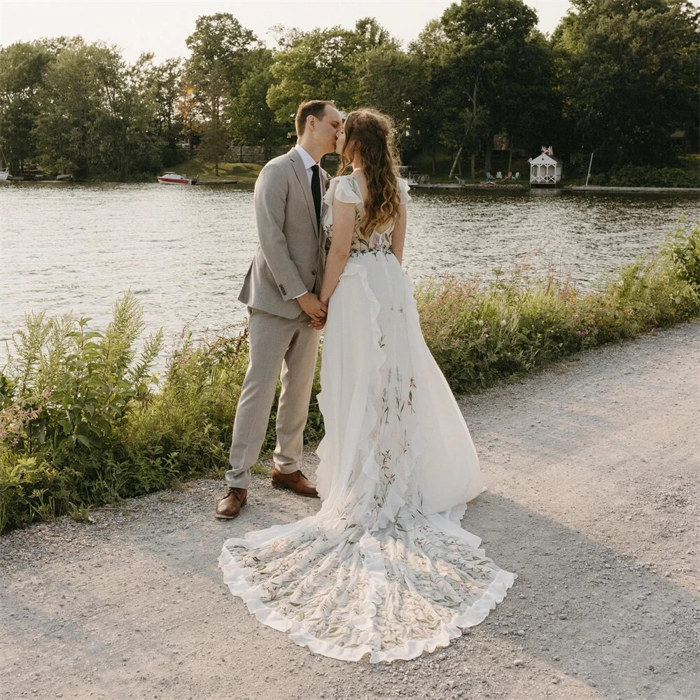 Elegant A-Line Wedding Dresses V-Neck Cap Sleeves 3D Flowers Chiffon Bridal Gown