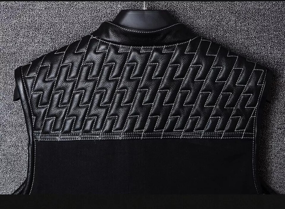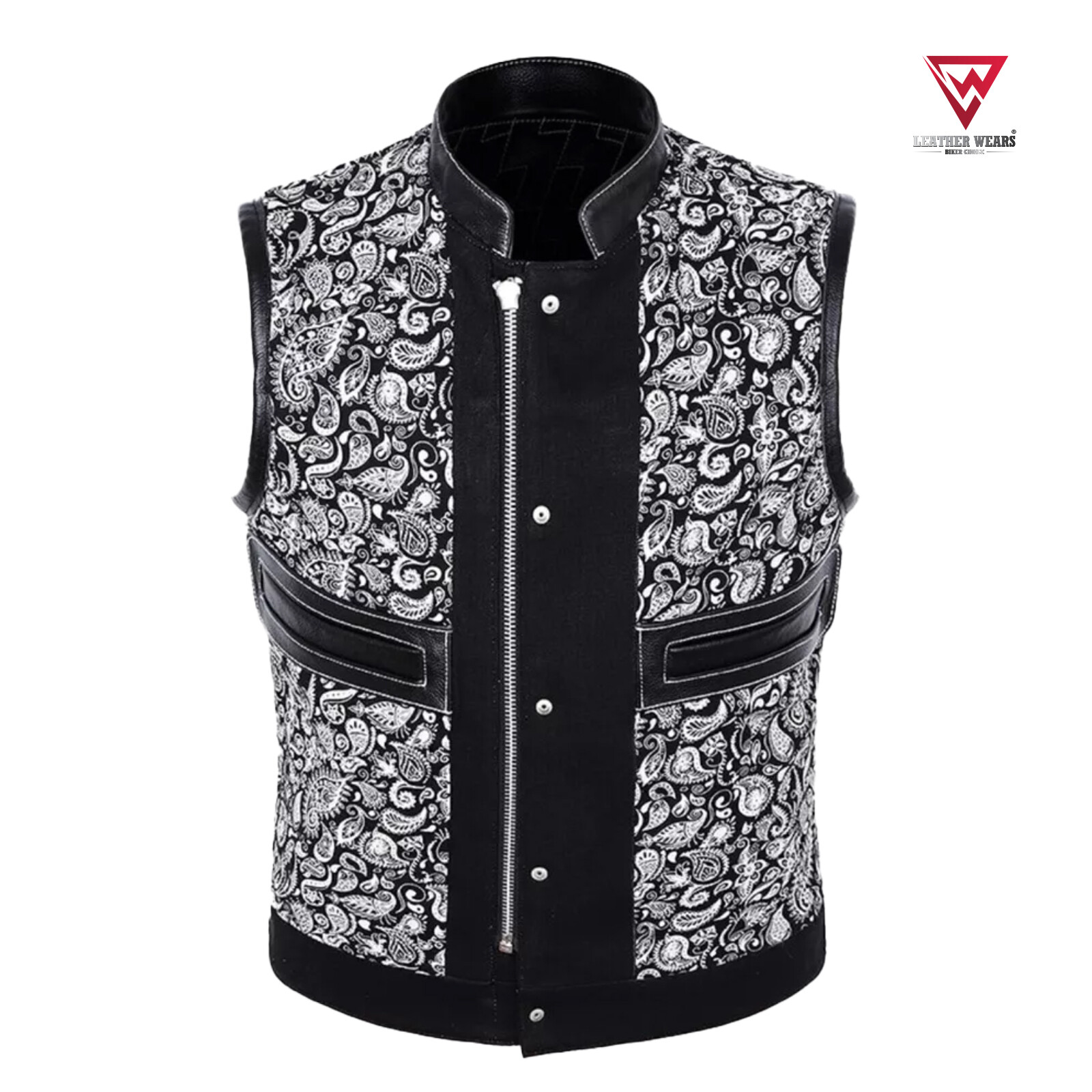 New Men's Hunt Denim Vest Paisley Club Biker Style Motorcycle Real Leather Vest