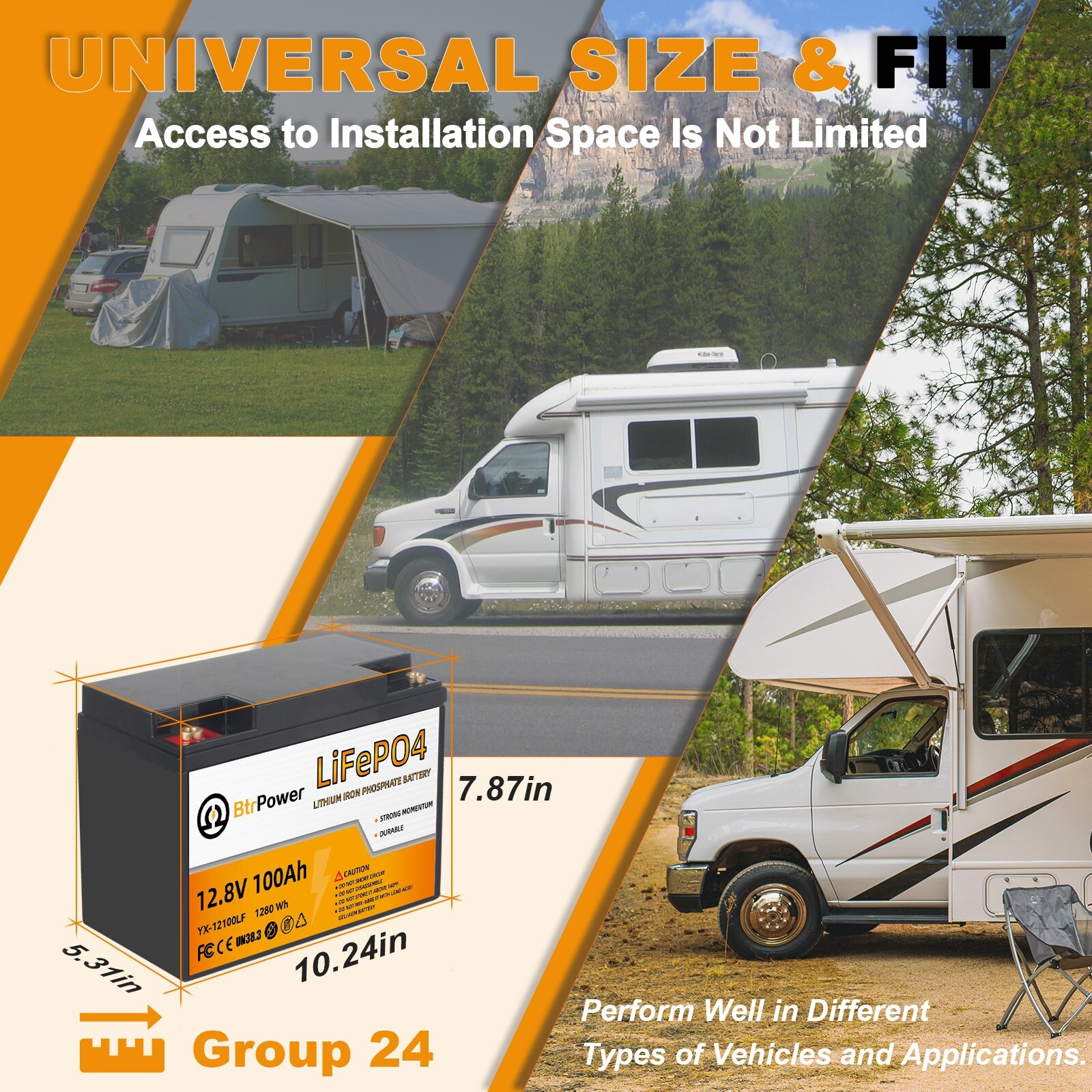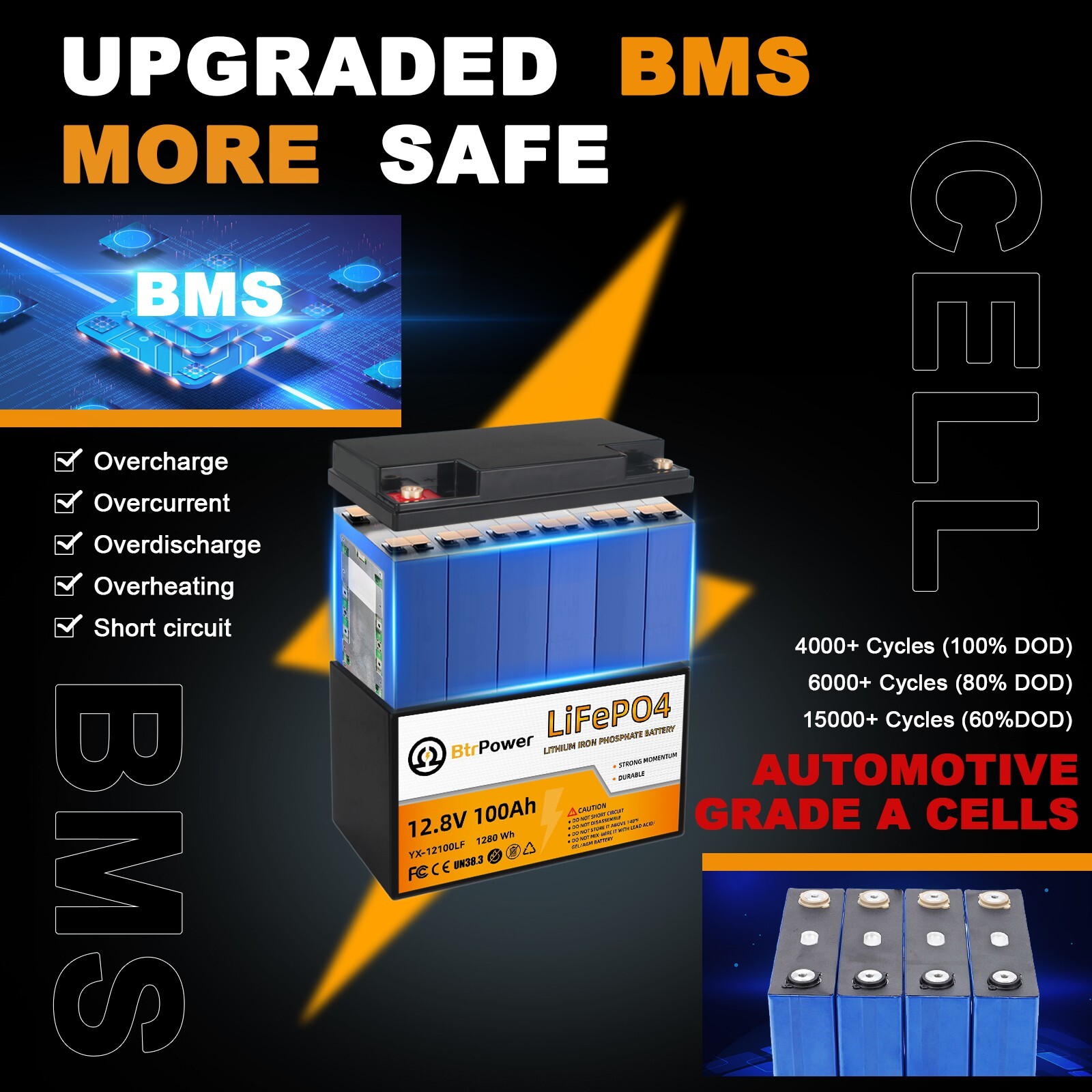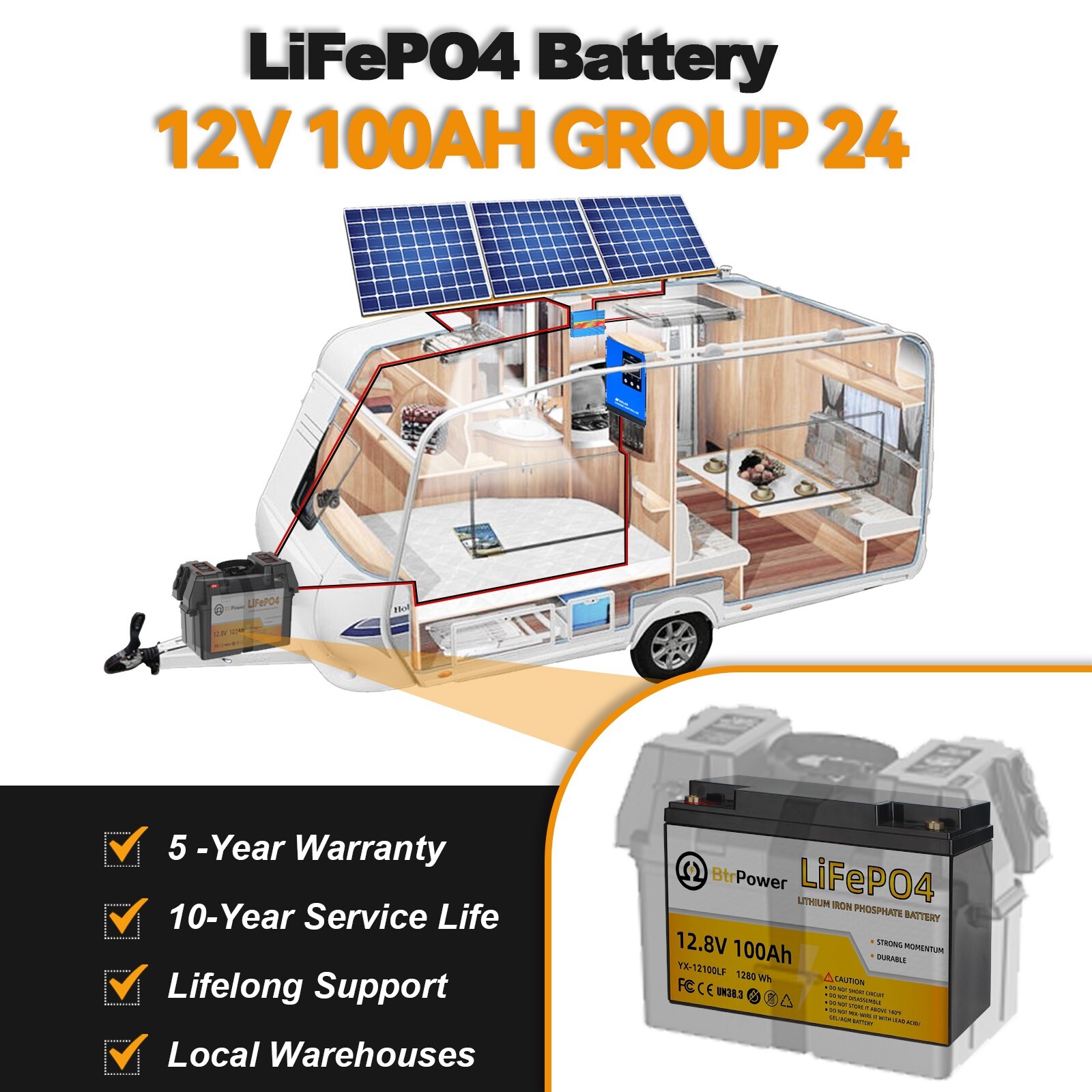 BtrPower 12V 100Ah LiFePO4 Lithium Battery Pack BMS for RV Solar Panel System