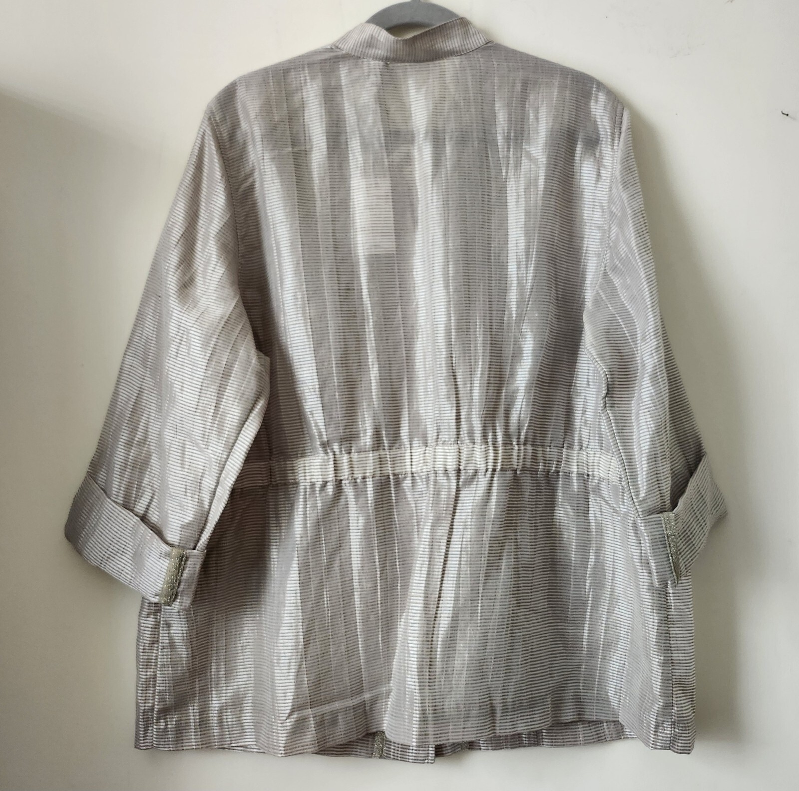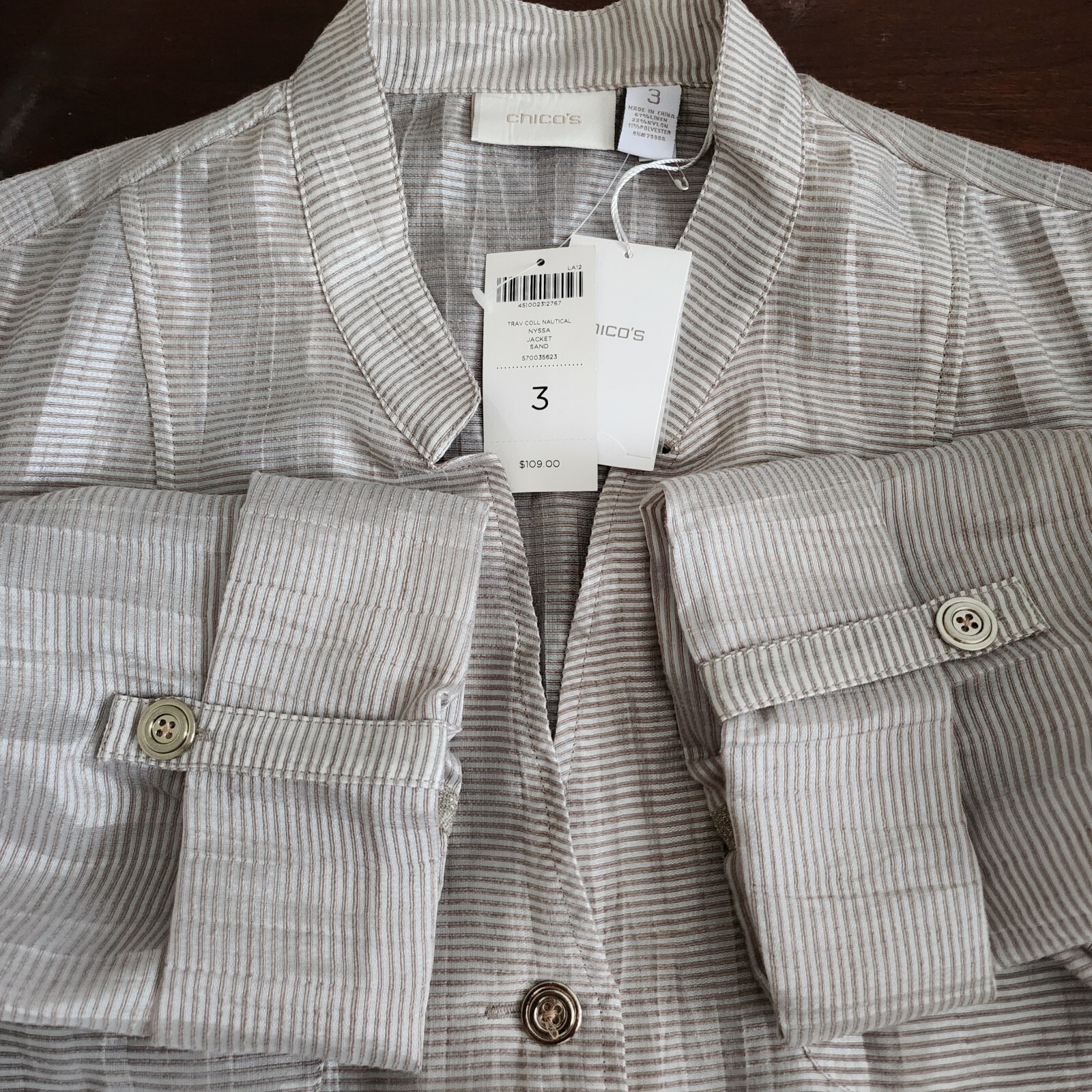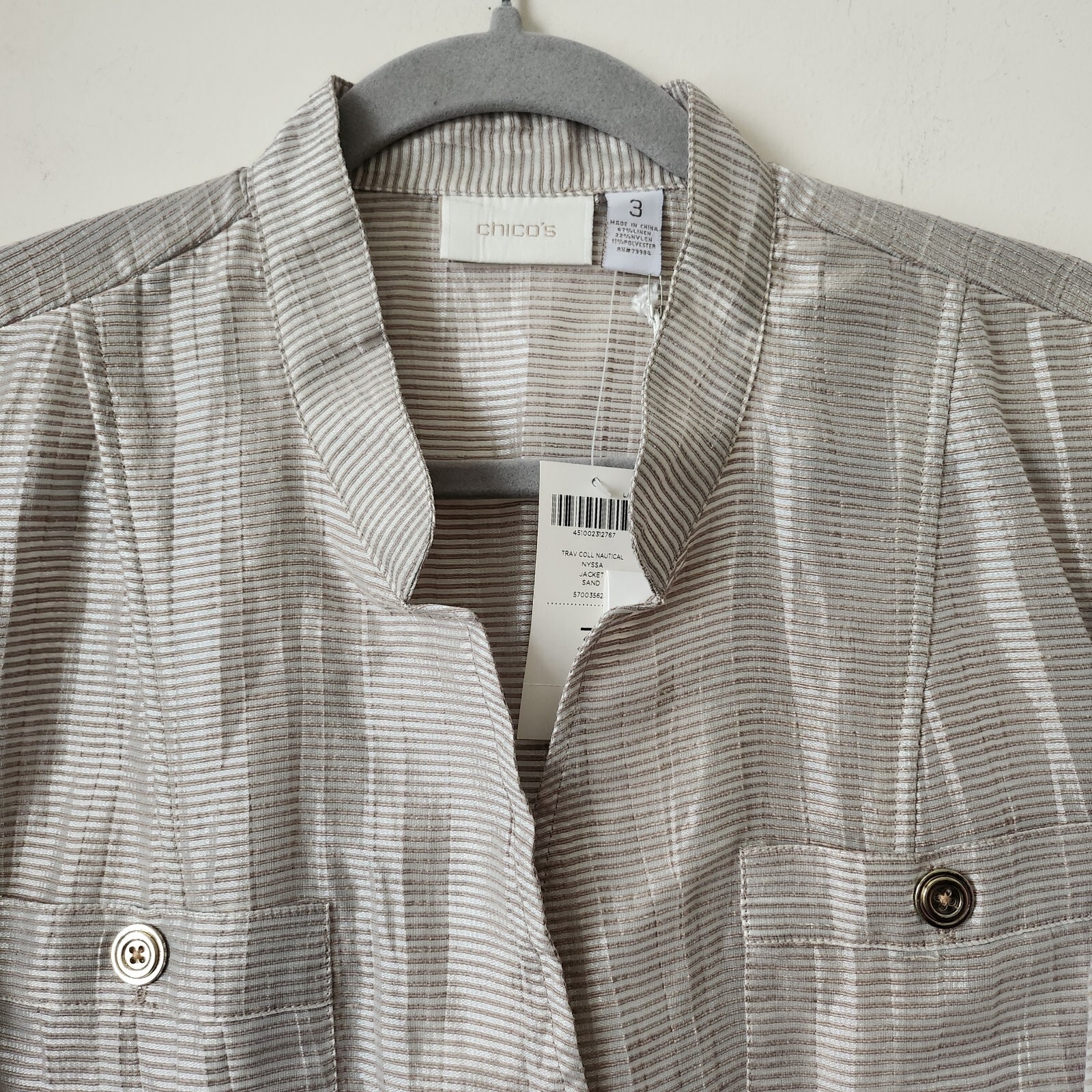 как выглядит NWT 109 CHICOS Trav Coll Nautical Nyssa Sand Silver Linen Blend Light Jacket 3 фото