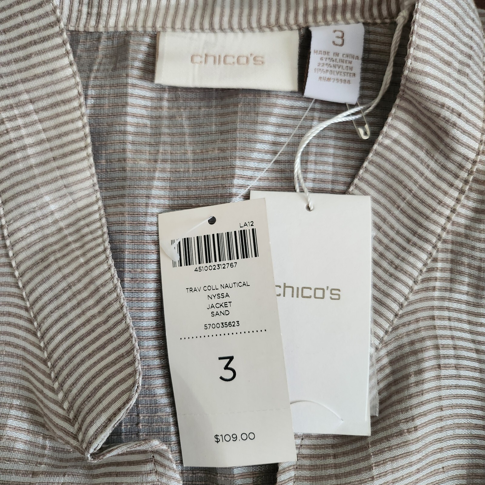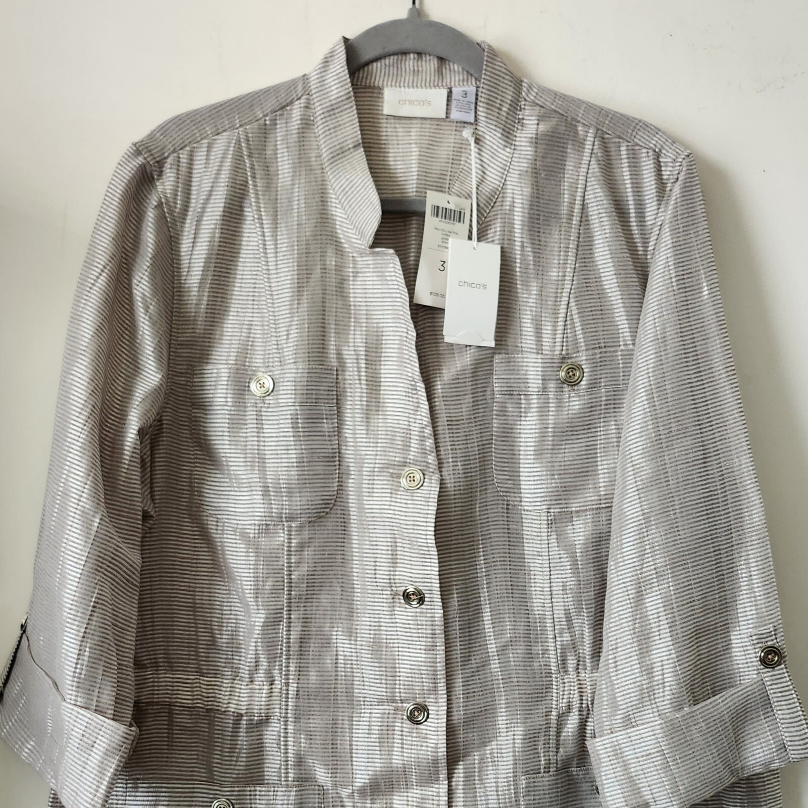 NWT 109 CHICO'S Trav Coll Nautical Nyssa Sand Silver Linen Blend Light Jacket 3