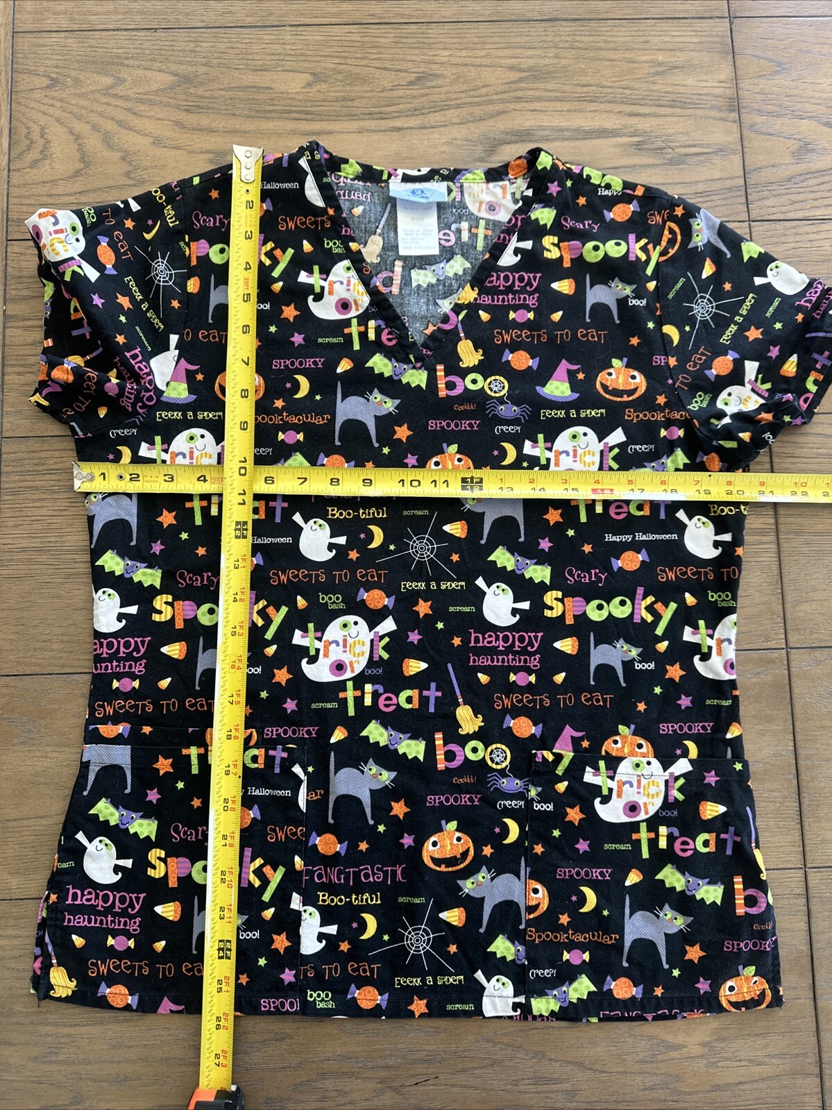 как выглядит Cute Halloween Medical Scrub Top Measure M/L Candy Ghost Pumpkin Cat Cotton фото