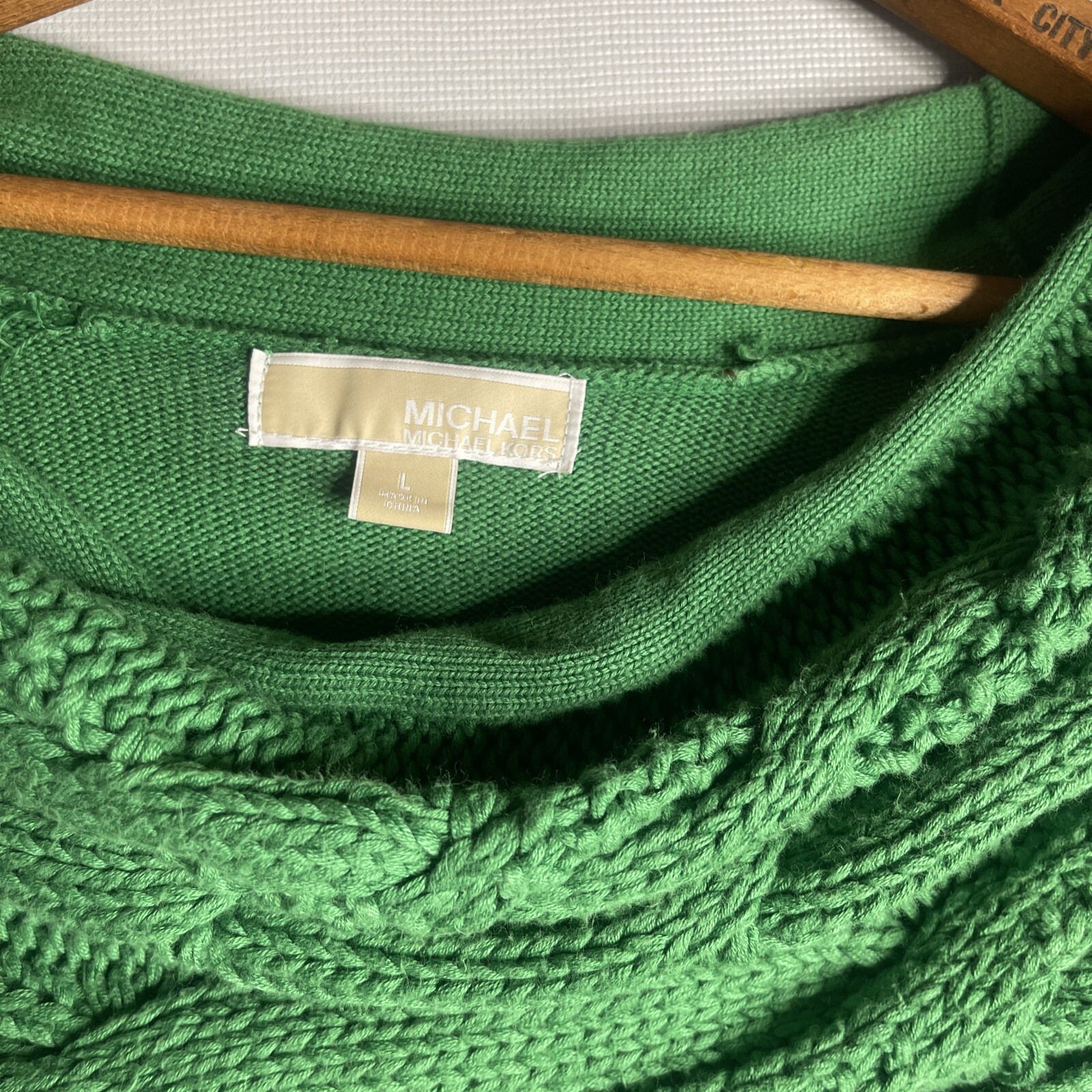 как выглядит Michael Kors green turtleneck sweater off the shoulder Size Large Knit See Pics фото